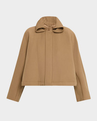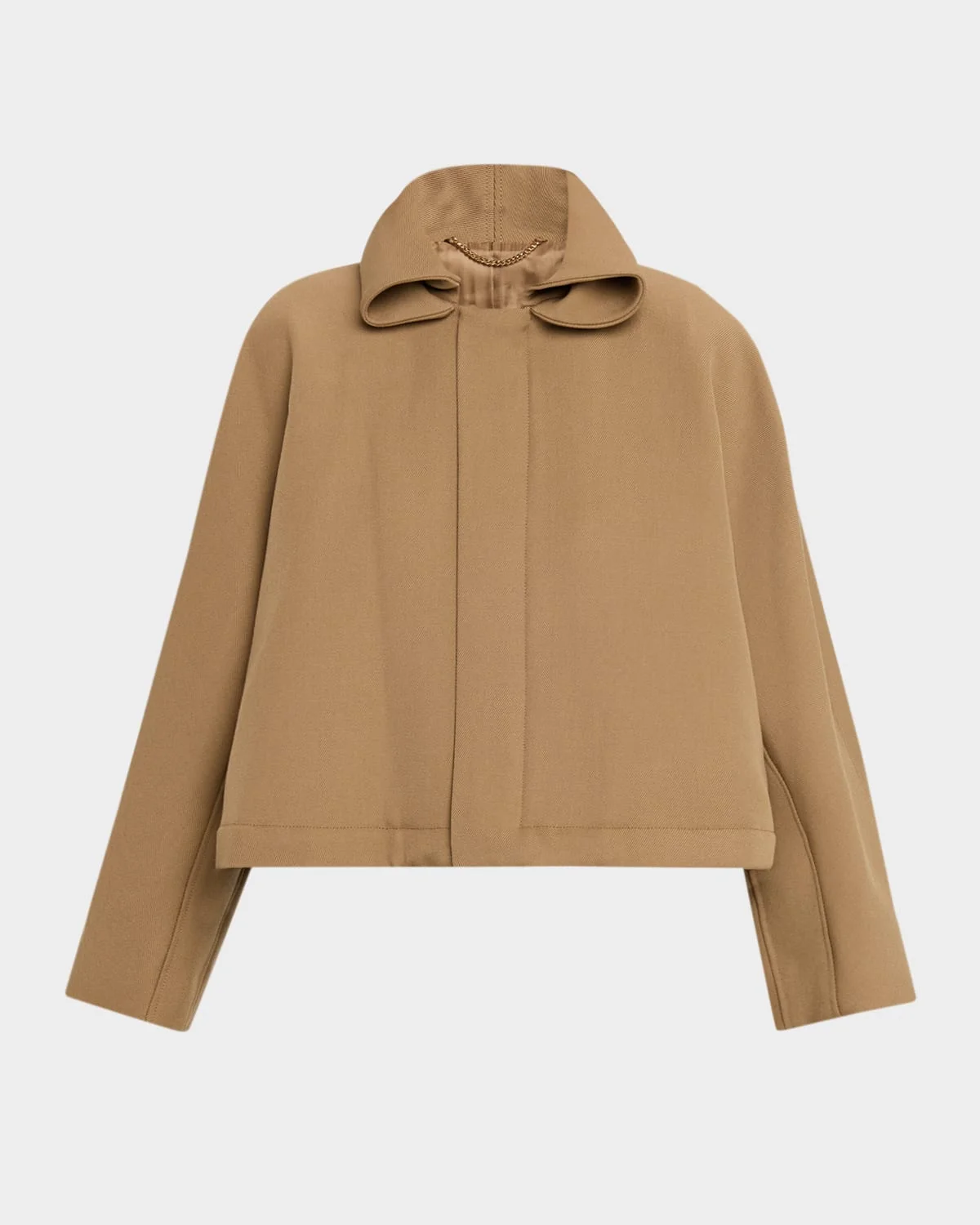 Victoria Beckham jacket is crafted of a wool twill featuring an oversized rolled collar and an elasticized back hem Roll collar; concealed zip front Long sleeves Straight fit Hip length Virgin wool Made in Lithuania