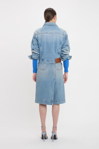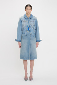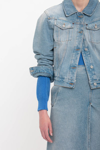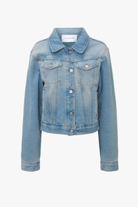 Luxury denim is a cornerstone of the Victoria Beckham brand and for SS25, the denim jacket is elevated with padded and quilted lining in the body and sleeves. Retaining it's laid-back appeal with a relaxed fit over the shoulders and closer silhouette at the hemline, it is presented in a Pale Blue wash perfect for achieving effortltess summer style. Distinctive design features include branded copper rivets, a branded leather patch on the waistband and silver branded denim shank buttons at the front closure, pockets and cuffs. Size & Fit - Relaxed fit over the shoulders with a closer fit at the hem - Fits true to size, take your regular size - The model height is 5'10''/179cm and is wearing a size 6 Product Details - Washed denim - Padded and quilted lining in body and sleeves - Silver branded denim shank buttons - Branded copper rivets - Branded leather patch on the waistband - 100% Cotton - Machine wash at 30C - Made In Italy