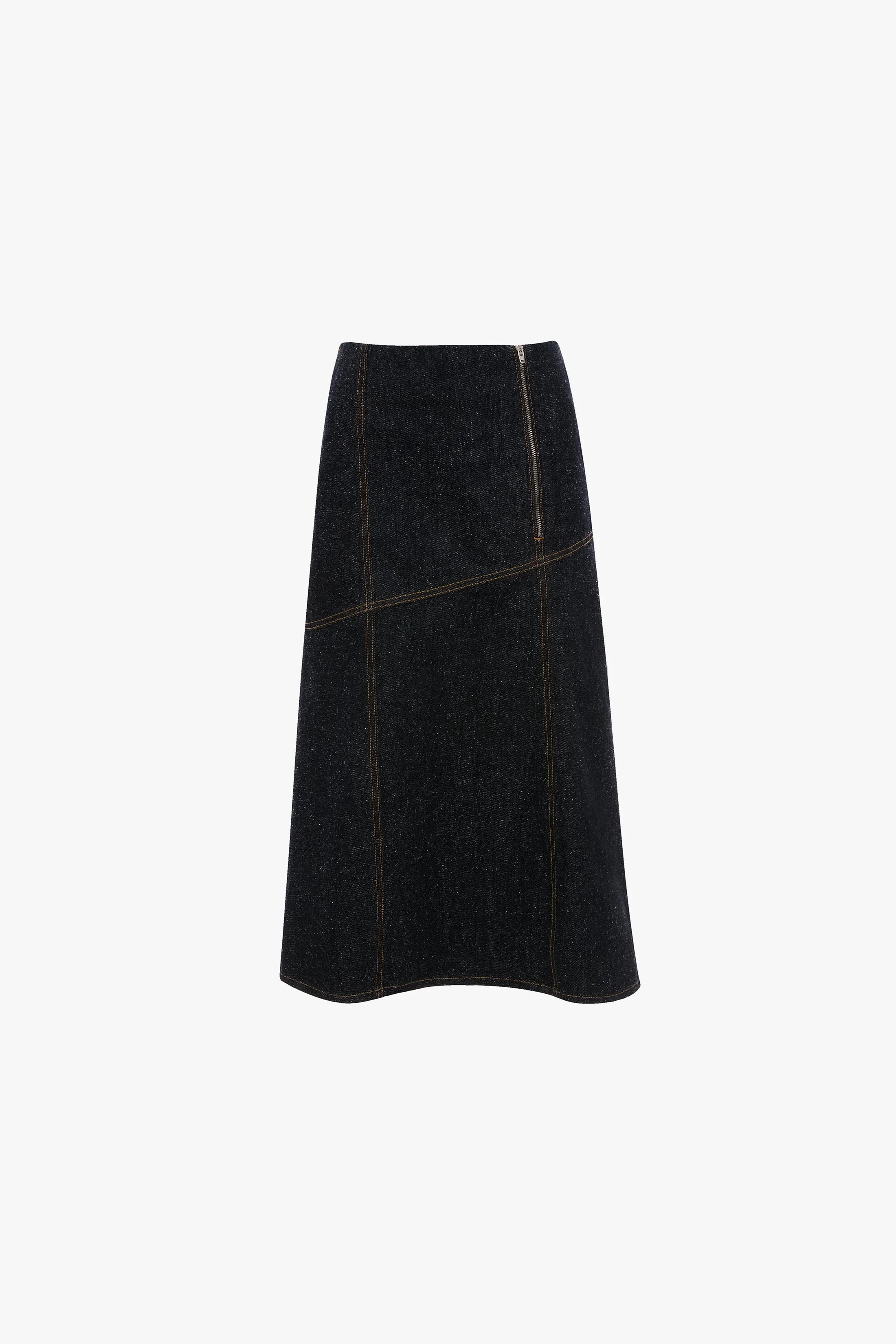 - Midi length - Exposed zip fastening - Panelled seams with topstitch detailing - Side pockets - Back gathered detail - 100% Cotton - Made in Italy A feminine take on utilitarian denim, the Denim Panelled Midi Skirt is crafted from an indigo boucle denim and cut to sit below the natural waistline. Panelled seams with topstitching bring definition to the silhouette, while a gathered detail at the back of the skirt adds a tactile point of difference. SIZE & FIT - Desigend to fit slightly below the natural waist - The model is 5'11’’/180cm and is wearing a size 26 - Fits true to size, take your normal size