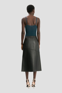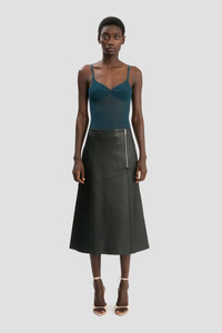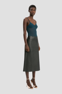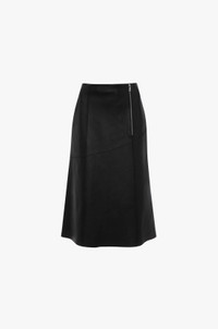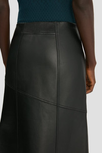 Supple nappa leather brings a sensuous undertone to this midi skirt in classic Black. Tactile talking points include a raw hem edge, elasticated panel at the back of the waist and diagonal hip seams with tonal topstitching. Size & Fit - The model is 5'11’’/180cm and is wearing a size 6 - Fits true to size, take your normal size Product Details - Nappa leather skirt - Midi length - Diagonal seams with tonal topstitching - Raw hem edge - Elastic waist panel - Exposed zip - Internal hook & bar closure - 100% Lamb Nappa - Made in Mauritius