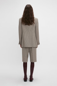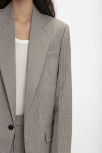 The Peak Lapel Jacket is reimagined in retro Dogtooth Check for the new season. It has a longer-length, oversized silhouette and a lower than usual break line for a more contemporary aesthetic. Traditional front flap pockets and a single welt pocket at the chest bring a refined polish to the look, while uncut buttonhole detailing at the cuffs complete the look. Styled with the Waistband Detailed Tailored Short, Fine Knit Vertical Stripe Tank, Flat Lace Up Mules, Victoria Clutch Bag and the Superfine Rib Socks Product Details - Dogtooth check virgin wool - Fully lined - Concealed centre front fastening - Relaxed fit - Front pockets - Front length 79 - Sleeve length: 62cm - Relaxed fit. For a more fitted silhouette, we advise taking a size down - The model height is 183cm and is wearing a size 6 - Main: 100% Virgin Wool. Lining: 100% Viscose. Second Lining: 70% Cotton 30% Polyamide - Dry clean only - Made in Portugal