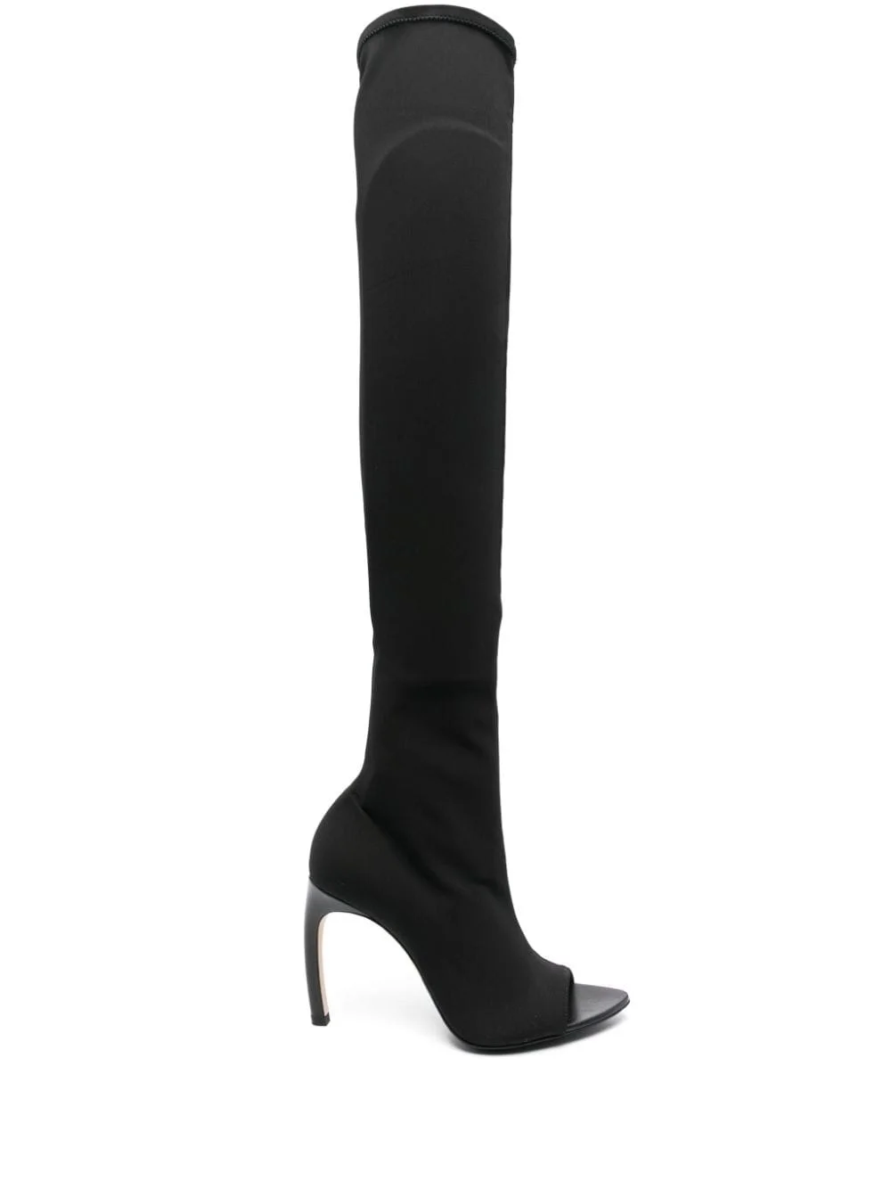 100mm peep-toe jersey boots Highlights - Black - Jersey texture - Peep toe - Pull-on style - 100mm high sculpted heel - Thigh-high - Branded insole - Leather sole Made in Italy Composition Lining: Fabric 100% Sole: Calf Leather 100% Outer: Fabric 100% SIZE & FIT Measurement HEEL 3.93 in(10 cm) HEIGHT 24.4 in(62 cm)