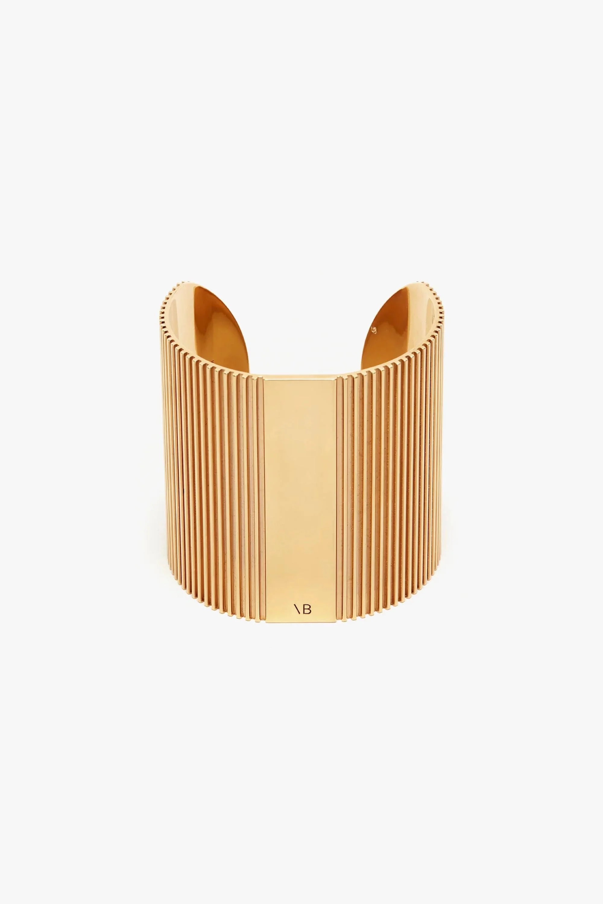 Exquisitely crafted from gold-plated brass, the Perfume Cuff is a bold, sculptural piece that will bring a contemporary edge to your accessories collection. The textured surface and VB logo add decorative interest, and the piece can be resized by simply exerting gentle pressure. Styled with the Jumbo Chain Earrings, Watch Chain Bracelet and the Tie-Detail Floor Length Dress Size & Fit - One Size - Height of the Bracelet: 5cm, Width of the Bracelet: 6cm - Depth of the Bracelet: 6cm - Thickness: 2mm Product Details - Gold Plated Brass - Victoria Beckham logo at the front of cuff - 100% Brass - Made in Italy