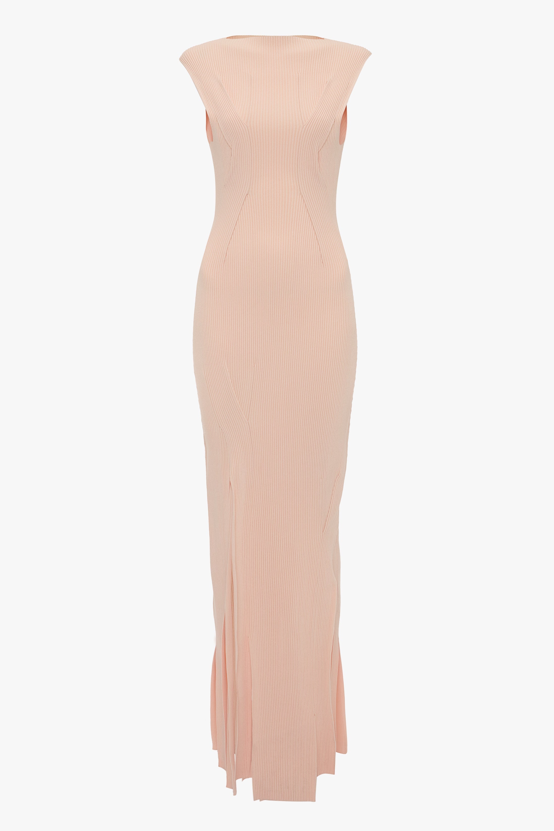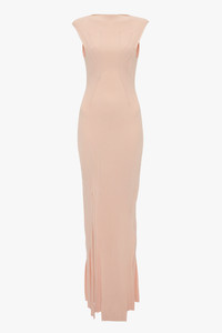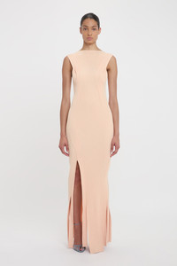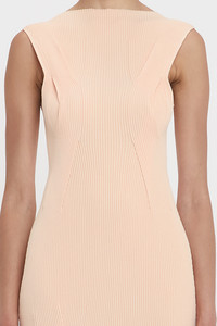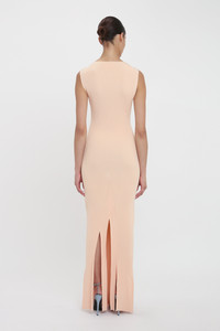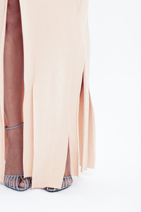 One of Victoria's personal favoutites for SS25, the Plait Detail Sleeveless Dress has an elongating and body-skimming silhouette that makes a confident statement. Crafted from a compact rib knit, it has a slashed neckline for a subtle point of difference. Distinctive design features include twisted rib panels fashioned into the knit and skirt splits with varying hem lenths. Presented in Pale Peach, it is a discreetly sexy piece. Size & Fit - Fits true to size, take your regular size - The model height is 5'10''/178cm and is wearing a size extra small Product Details - Full length silhouette - Compact rib - Twisting rib panels fashioned into the knit - Varrying lengths and splits in hem - Leg slit - Sleeveless - Slash neck - 87% Viscose Nylon 13% Nylon Elastane - Dry clean only - Made In China