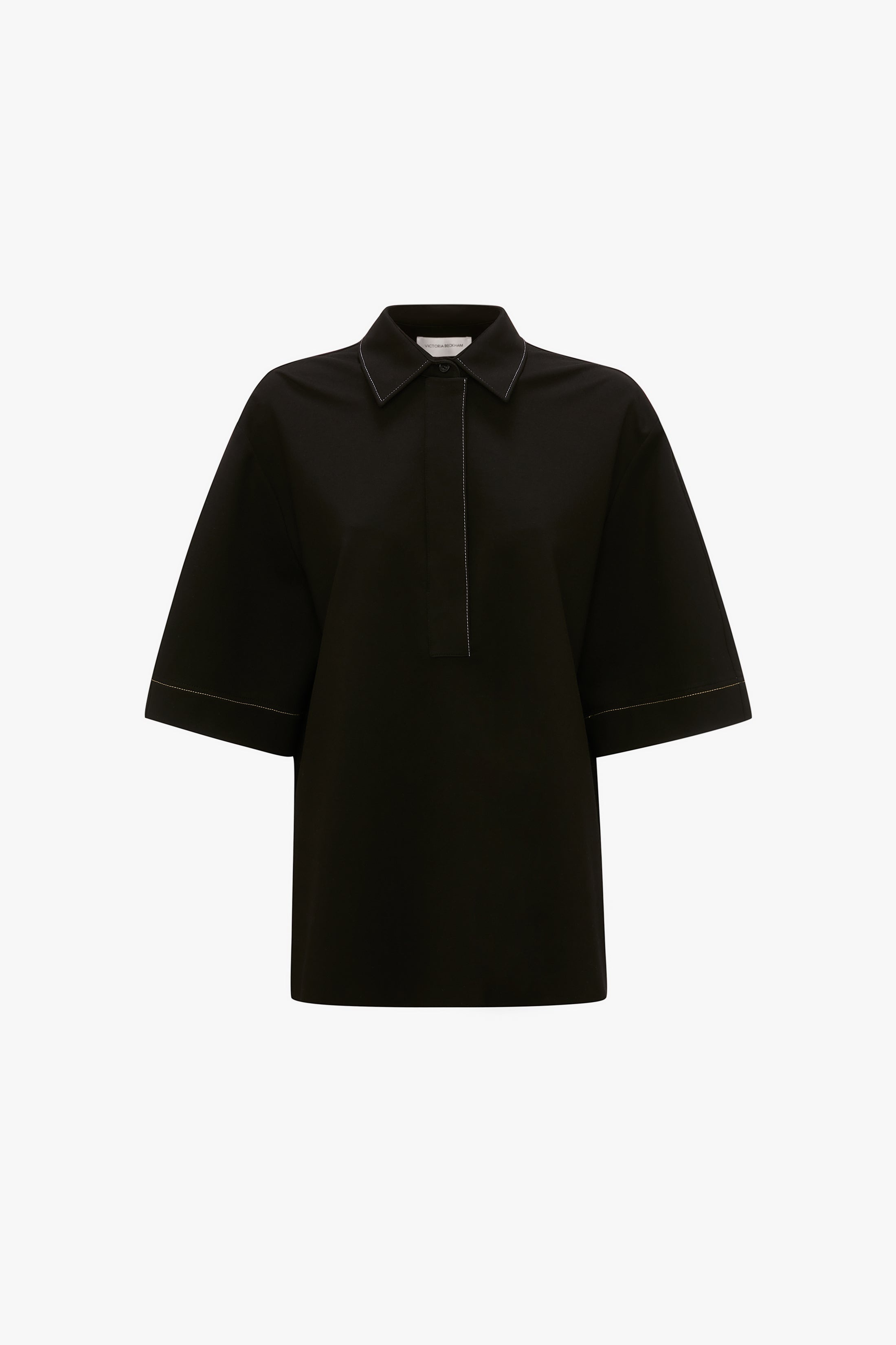 Embrace a laid-back but pulled-together look with the Pointed Collar Shirt. Designed with relaxed mid-length sleeves and an oversized silhouette, this black shirt embodies contemporary casual style. Contrast white stitching adds visual interest.Styled with the and the Product Details - Ponti-jersey stretch fabrication - Mid length sleeves - Polo collar design, with button fastenings - Contrast stitching detail - Oversized fit, for a slimmer silhouette, we recommend taking a size down - The model height is 180cm and is wearing a size 6 - 67% Viscose 28% Polyester 5% Elastane - Machine wash - Made in Turkey