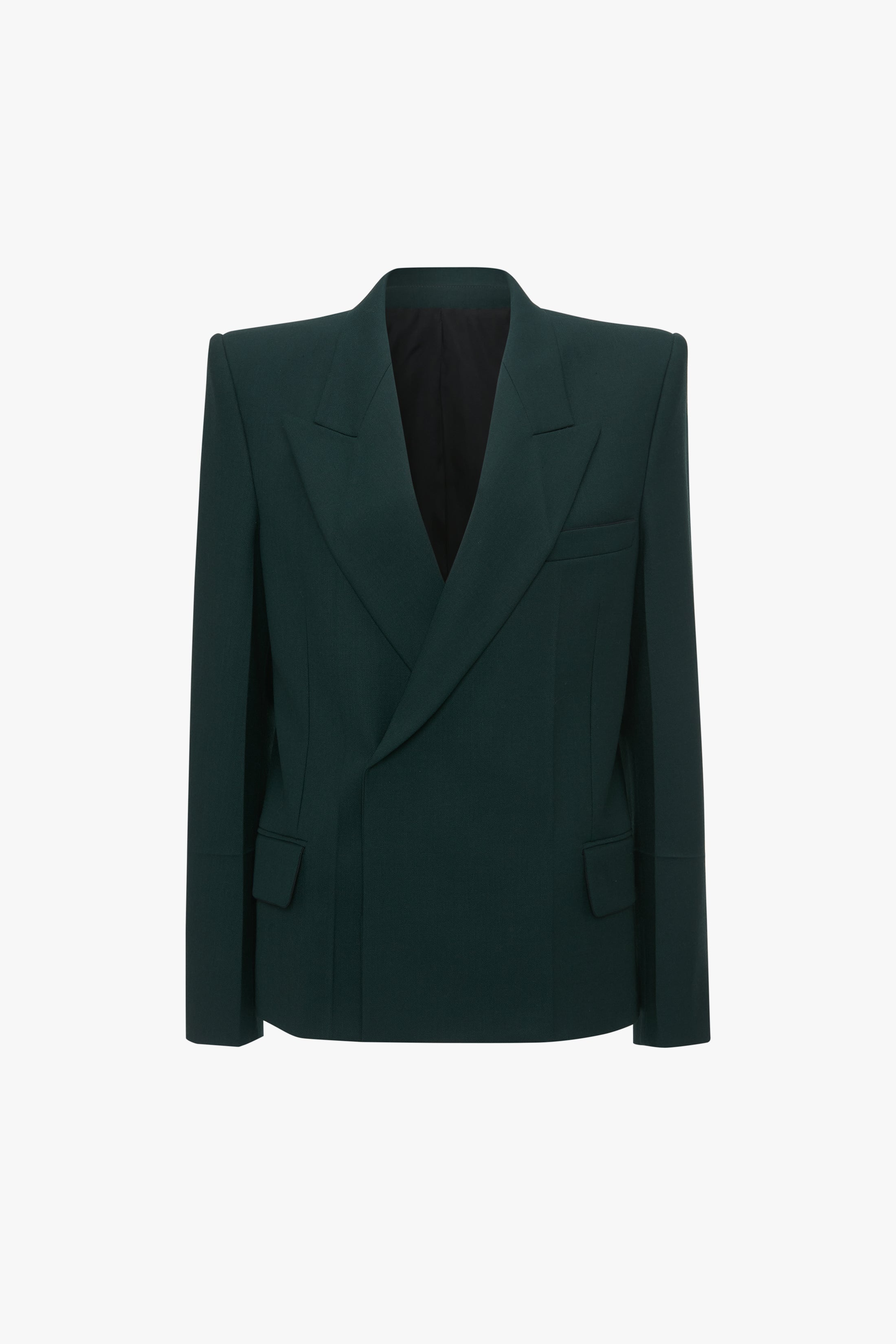 Classic suiting is reframed for the new season with a distinctive wide shoulder line and double-breasted fit. A personal favourite of Victoria’s from the AW24 runway, this Pointed Shoulder Jacket in sophisticated Seaweed has minimal detailing, with discrete contrast stitching on the back sleeve seam and slim front pockets adding subtle points of interest. Hard creases through the body and sleeve add further definition to the striking silhouette. Product Details - Wide shoulder detail - Contrast bind at front pockets - Contrast stitch at back sleeve seam - Hard creases on the body and sleeved - Double breasted - The model is 178cm and is wearing a size 6 - Main: 97% Virgin Wool 2% Polyamide 1% Elastane, Lining: 100% Viscose, Lining 2: 70% Cotton 30% Polyamide - Dry clean only - Made in Bulgaria