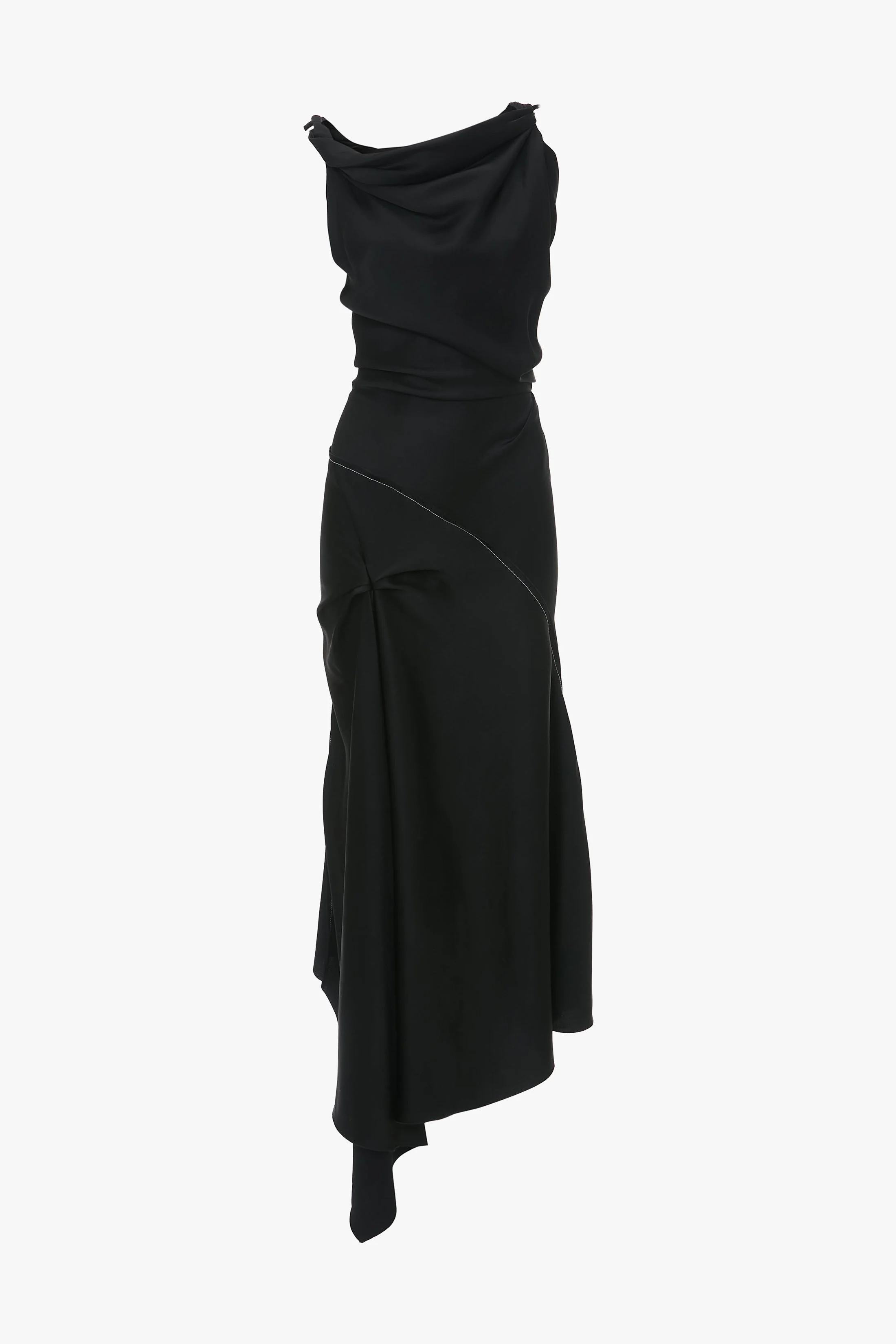 - Twist detail on shoulder straps - V-shape back waist seam - Front skirt drape - Exposed seams and contrast topstitching details - Asymmetric hem - Concealed zip with hook and eye closure at back - Fitted at the waist - 71% Acetate 29% Viscose - Dry clean only - Made In Portugal The classic black dress is updated with contemporary talking points in the Posy Midi Dress. A tactile twisted detail at the shoulder straps, an elegant drape at the front of the skirt and an asymmetric hemline create a directional silhouette, while the crepe back satin fabric ensures a luxurious fit and finish. Exposed seams and contrast topstitching elevate the look further. SIZE & FIT - Fits true to size, take your regular size - The model height is 5'10''/179cm and is wearing a size 6 Standard - Standard Length: 40"/103cm - Short Length: 37”/94cm - Please refer to size chart for product measurements
