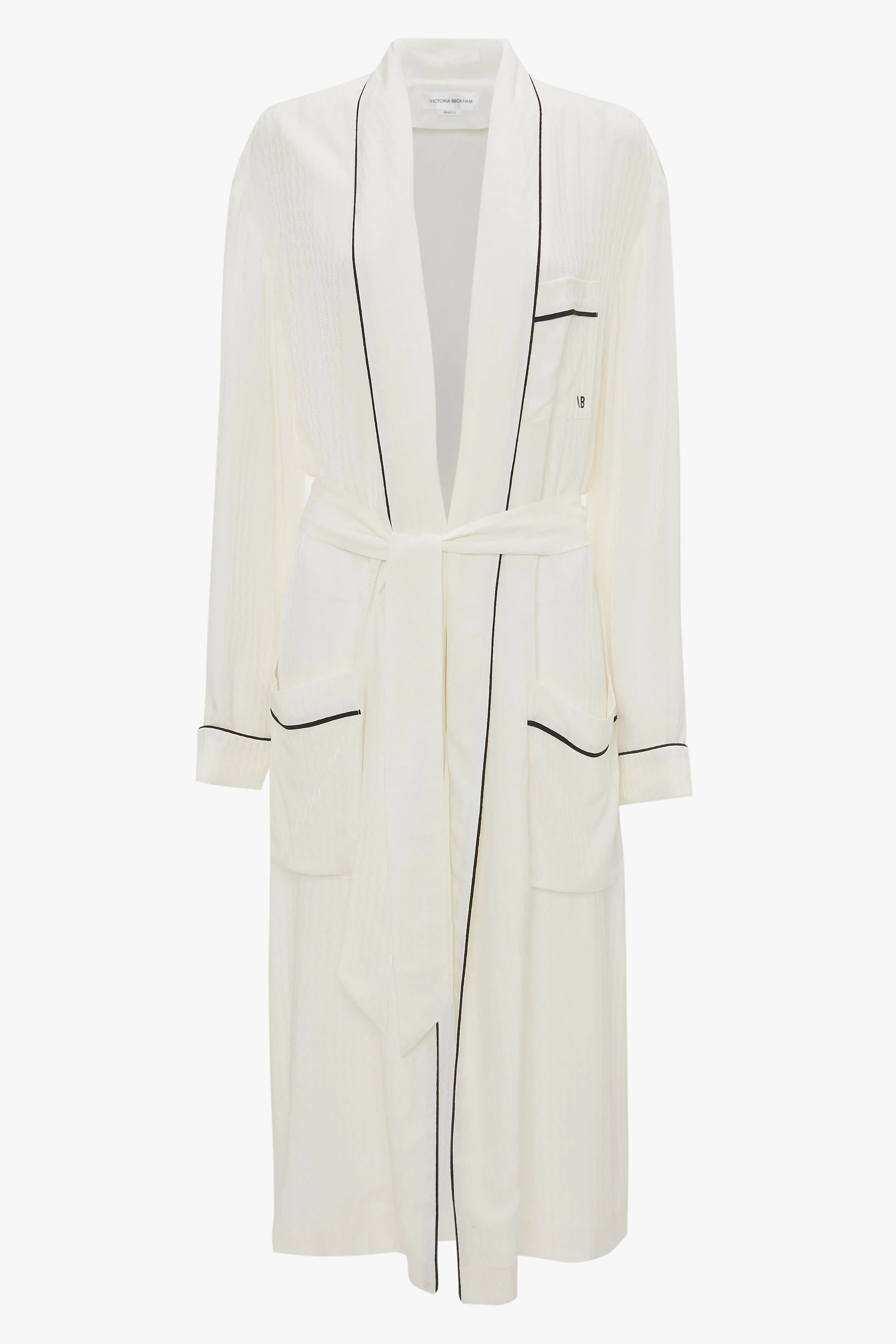 Designed for a relaxed fit, the Pyjama Robe in romantic Ivory has a laid-back attitude. Meticulously made with elevated design details, including a curved collar, piped hemline finish and front patch pockets. Printed with the house’s signature VB monogram, it is an elegant throwover for everyday. Styled with the Pyjama Sleep Set In Ivory Size & Fit - Midi length: 83cm - Fits true to size, take your regular size - The model height is 178cm and is wearing a size 6 Product Details - Soft silk fabrication - 65% Viscose 35% Modal - Dry clean only - Made In Portugal