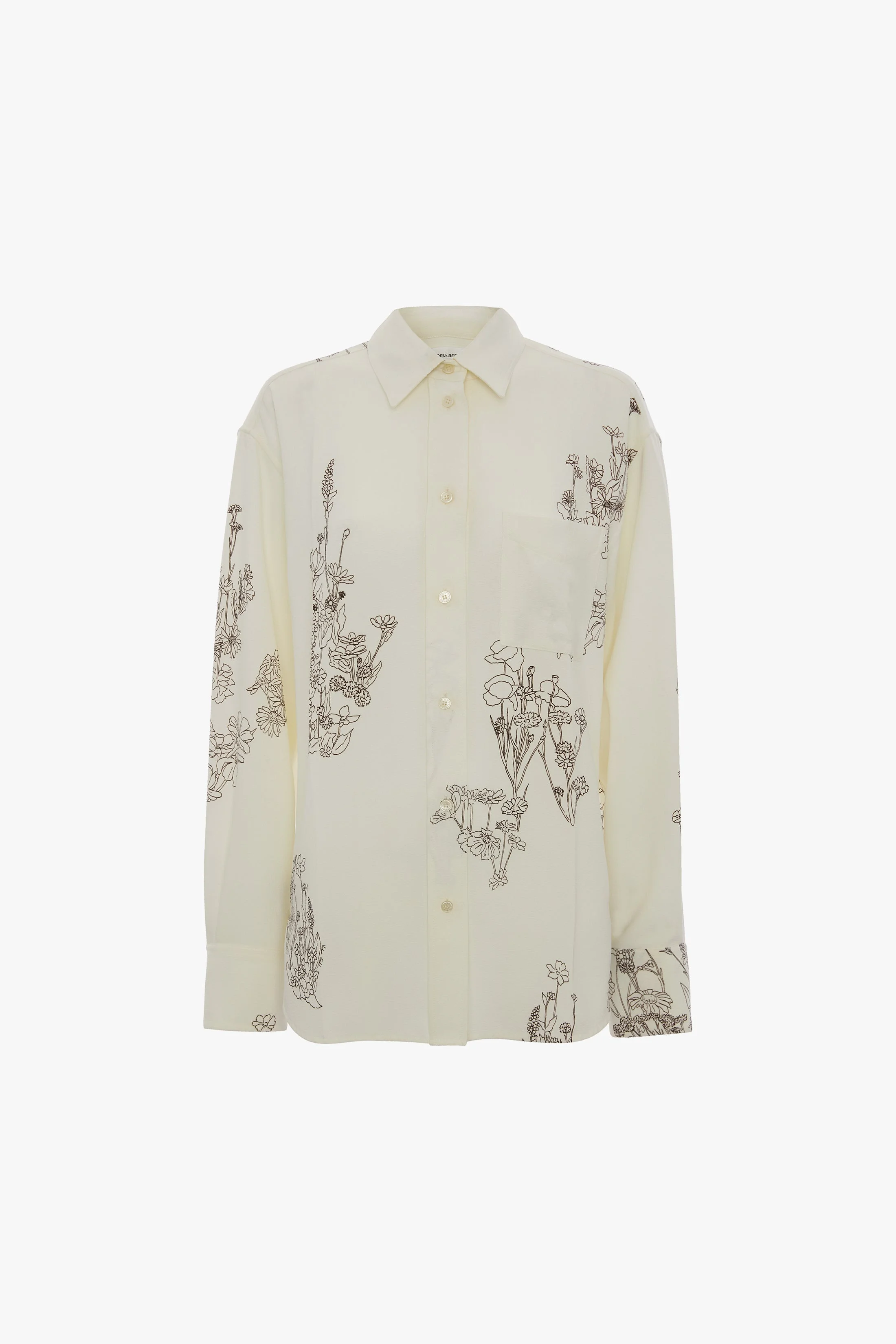 - Printed sable cady fabrication - Back yoke with tonal topstitch - Singular button cuffs - Patch pocket - Contrast VB logo embroidery - 100% Viscose - Made in Portugal A pretty floral design brings a feminine point of difference to the Pyjama Shirt’s boyish undertone. Defined by a softly structured silhouette, it has patch pockets, cuff plackets and a back yoke with tonal topstitching. It is an elevated take on the everyday. SIZE & FIT - The model is 5'11’’/180cm and is wearing a size 6 - Oversized fit: This style is designed to create an relaxed silhouette