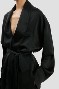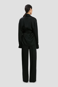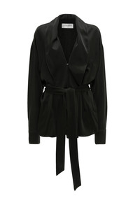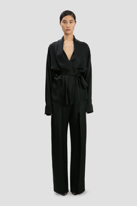 Deconstructed tailoring is part of the Victoria Beckham brand DNA and it is embodied in the Pyjama Wrap Blouse in classic Black. Crafted from tactile crepe back satin, it is defined by an oversized fit, distinctive shawl collar and fluid wrap belt. Elevated design details include decorative piping on the cuffs, chest pocket and belt, while a centre front button closure beneath the wrap belt ensures comfort and modesty. Size & Fit - Designed to fit oversized. For a more fitted look, take one size down - The model height is 5'11’’/180.5cm and is wearing a size 10 Product Details - Oversized fit - Centre front button closure with wrap belt - Button cuffs - Shawl collar - Chect pocket - Piping detail on cuff , pocket edge & belt - 71% Acetate 29% Viscose - Dry clean only - Made in Portugal