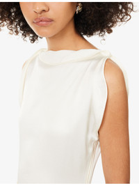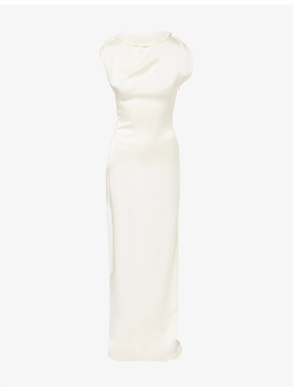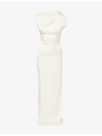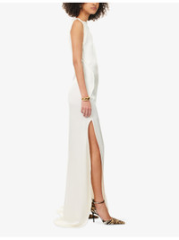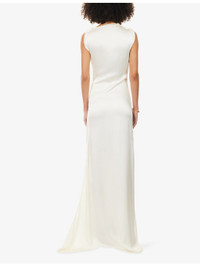 PRODUCT DETAILS - Victoria Beckham satin maxi dress - 71% acetate, 29% viscose - Concealed zip fastening at side - Regular fit, boat neck, sleeveless, thigh-high slits at sides, satin finish, ankle length - Dry clean only - Made in Italy - True to size - Size UK 8: length 65in / 165cm - Model is 5ft 10in/1.78m and wears a size UK 8 - Lightweight, non-stretch Ref: R04586920