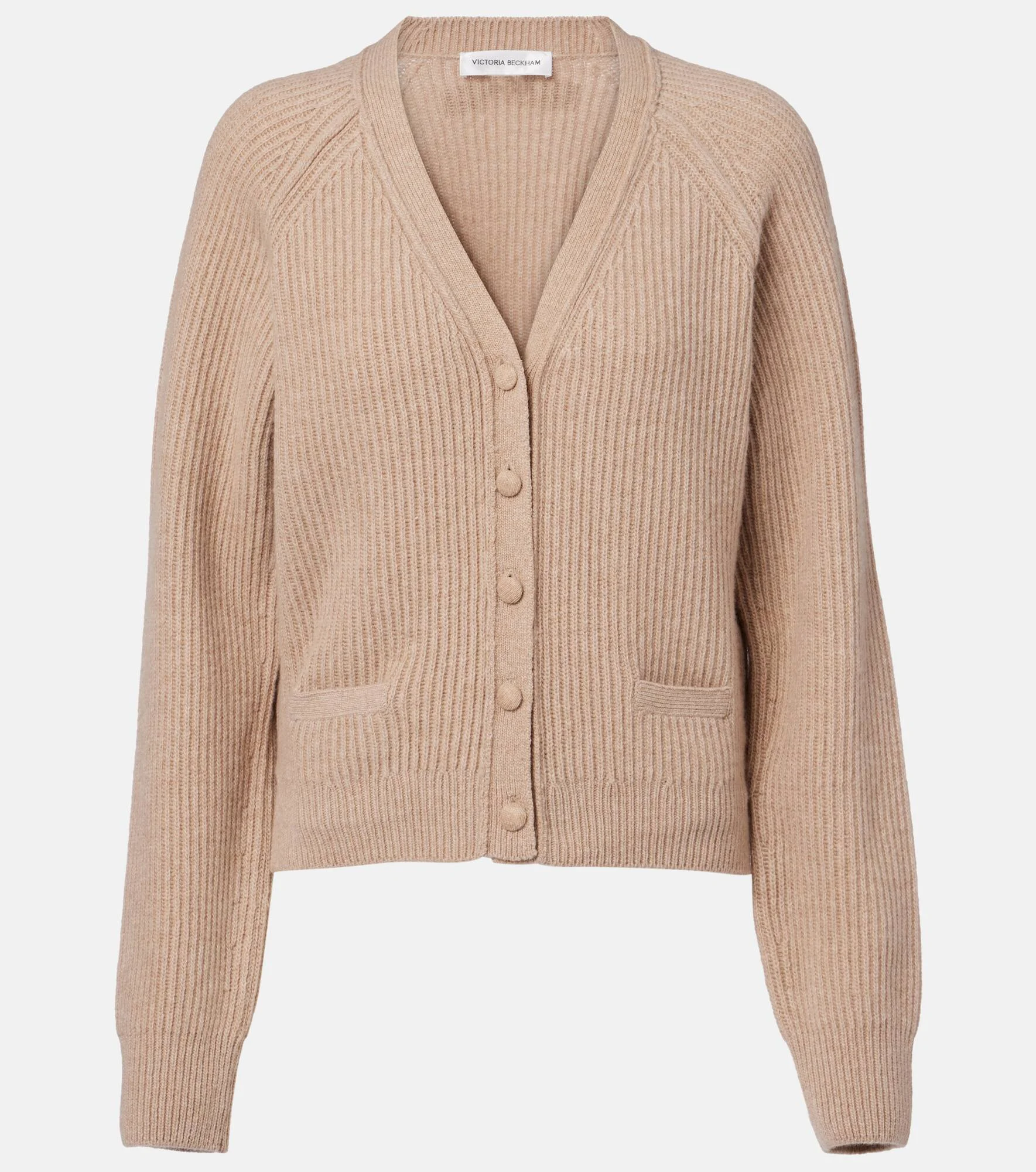 Victoria Beckham's eponymous label centers around chicly understated styles to create a versatile wardrobe. Effortlessly elegant, this ribbed cardigan is knitted from a warm blend of wool and cashmere threads. Product Details - Material: 70% wool, 30% cashmere - Care instructions: dry clean - Made in Turkey - Designer color name: Sand - Item color: beige - Item number: P01053825 Size & Fit - True to size - Straight fit - Stretchy fabric - Slightly cropped - The model seen in the picture is 178cm-5'10" and wearing a size XS