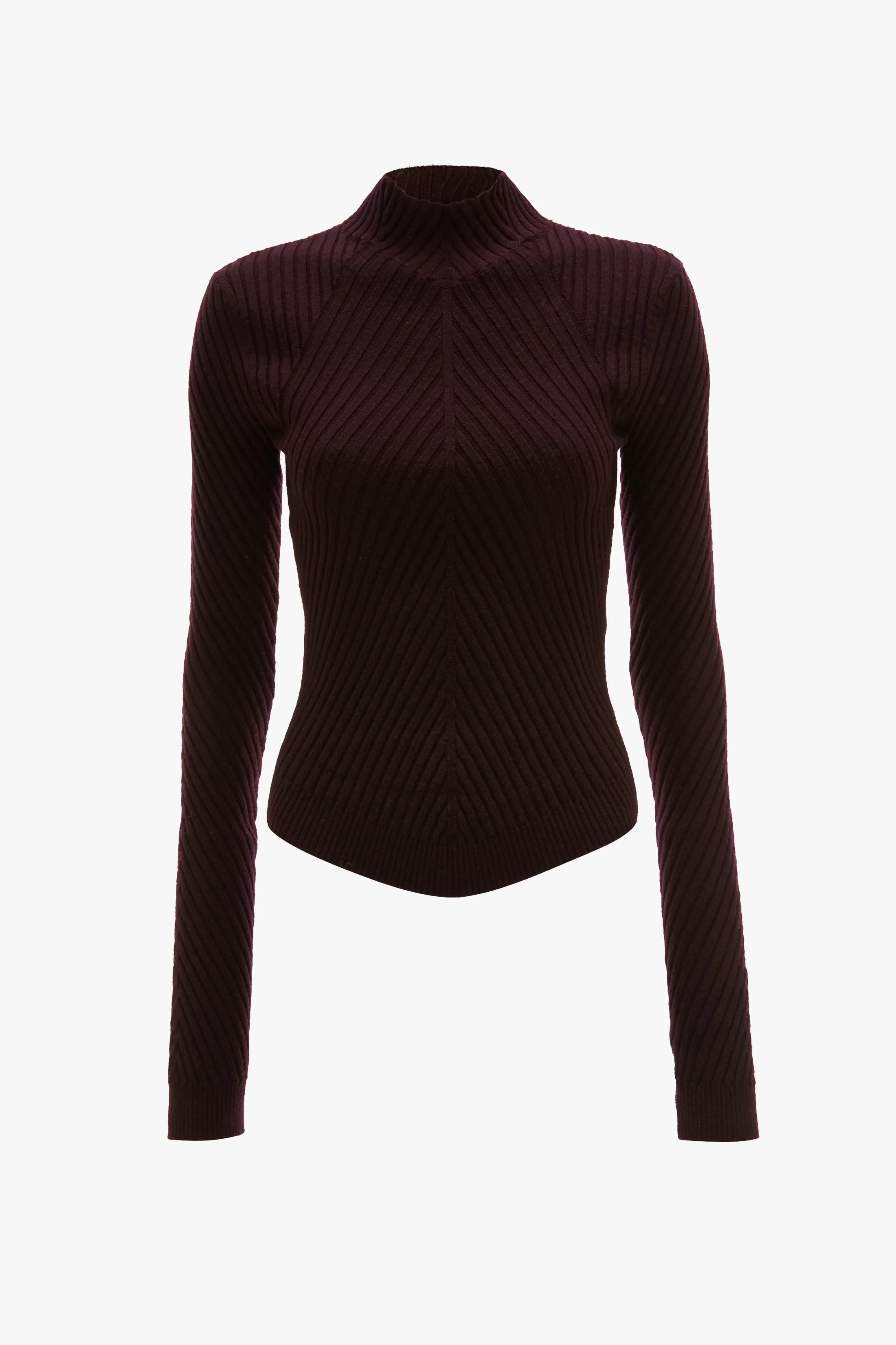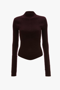 Soft merino wool with a tactile ribbed finish elevates this polo-neck beyond a wardrobe basic. A unique V-shaped, high-neck design and curved V-shape hemline, dipping longer at the front, add distinctive design elements, while the rich shade of Merlot is endlessly versatile. Long sleeves with fashioned thumbholes and a tape with tonal Victoria Beckham embroidery at the back of the neck complete the look. Size & Fit - Fits true to size, take your regular size - The model height is 5'11’’/180.5cm and is wearing a size S Product Details - Fine gauge rib - High neck with V shape design - Curved v shape hem dipping longer at the front - Long sleeves with fashioned thumbholes - Soft merino wool - 100% Merino Wool - Dry Clean Only - Made in China