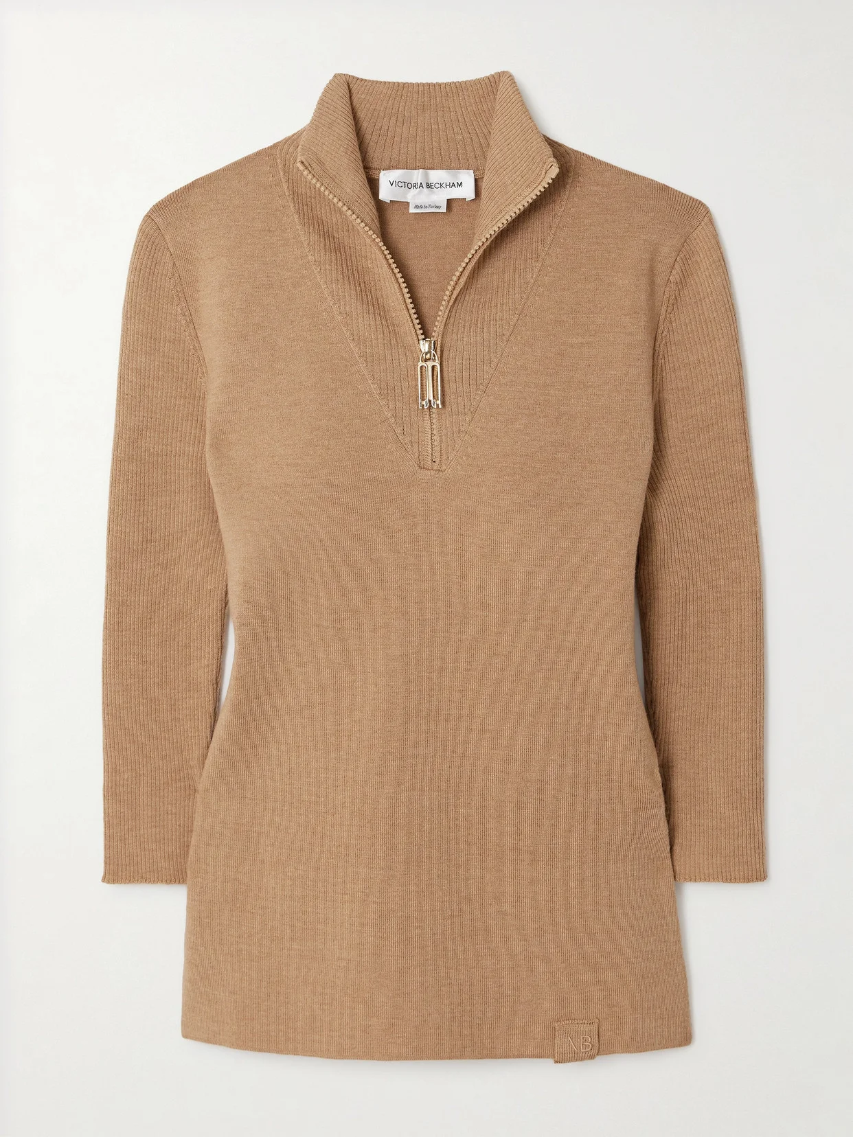 Victoria Beckham's sweater has a half-zip placket that you can leave undone or style as a funnel neck. It's made from a merino wool-blend for a close fit and finished with ribbed trims along the three-quarter sleeves and neckline.