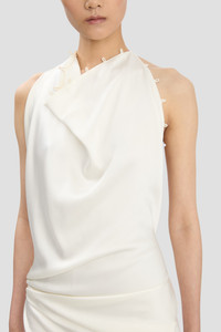 Contemporary evening wear is part of the Victoria Beckham brand DNA and the Rouleaux Detail Sleeveless Gown expresses this signature aesthetic beautifully. Defined by a distinctive draped neckline with rouleaux ties and a draped pleat at the skirt’s side seam, it has a tactility that is sensuous and modern. Crafted from crepe back satin for a figure-flattering fluidity, it has an extended rouleaux trim along the bodice drape and skirt seams and is presented in romantic Ivory. Size & Fit - Fitted around the hip - Fits true to size, take your regular size - The model height is 5'11’’/180.5cm and is wearing a size 6 Product Details - Crepe back satin, draped rouleau detail gown - Draped neckline with rouleau ties - Draped pleat detail at skirt side seam - 71% Acetate 29% Viscose - Dry clean only - Made in Portugal