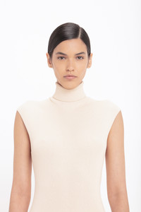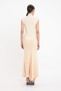 With its roll neck design and longer-length drape at the front of the skirt, the Cap Sleeve Knit Detail Midi has an elongating silhouette. The ribbed knit bodice and viscose crepe skirt create a textural contrast that adds visual interest, while an asymmetric hemline adds another point of difference. Presented in Pale Peach, it is one of Victoria’s personal picks for SS25. Product Details - Knitted rib bodice - Roll neck - Viscose crepe skirt - Drape and gather detail on skirt - Asymmetric hem - Concealed zip closure at side seam - Fitted through body and hip - Fits true to size, take your regular size - The model height is 5'10''/179cm and is wearing a size 6 - 100% Viscose - Dry clean only - Made In Turkey