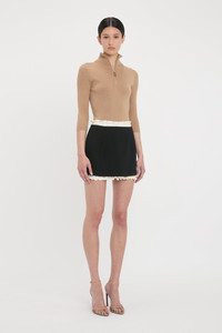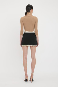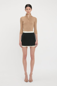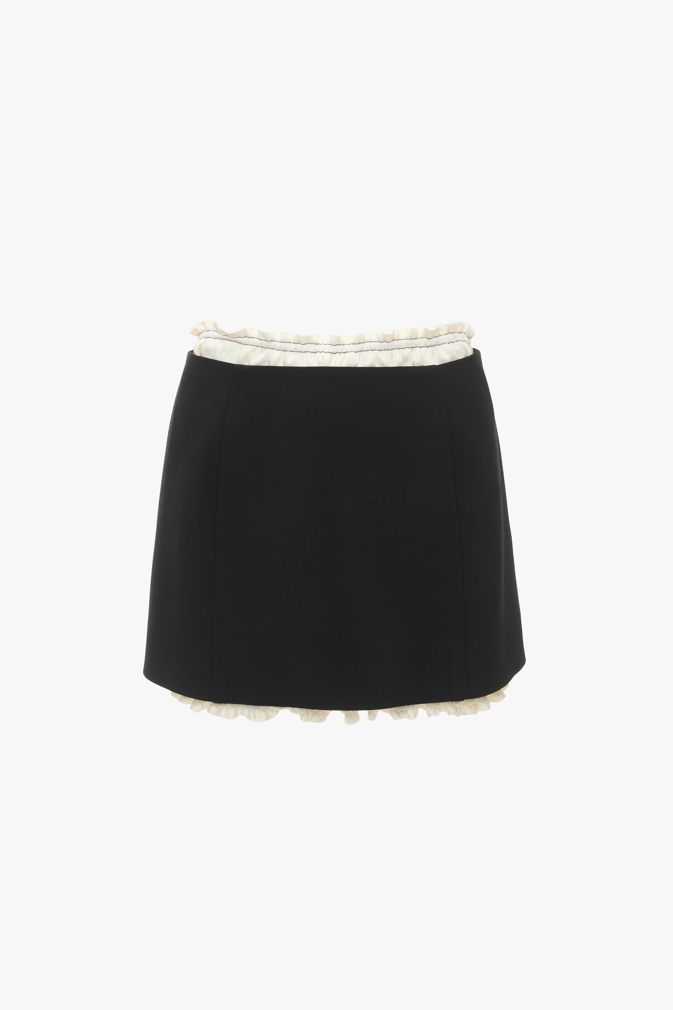 Crafted from double wool crepe with a slight stretch, the Ruched Detail Mini Skirt reflects the house’s playful personality. Contrast ruching at the waist and hemline brings a flirtatious sentiment to the clean lines of the skirt, while crepe back satin ruched panels add a sensuous tactility. One of Victoria’s picks for SS25, it marries structure and softness beautifully. Product Details - Double wool crepe fabric with slight stretch - Front and back tonal skirt seaming - Shiny contrast crepe back satin ruched panels along top and bottom of skirt - Contrast stitch detail along top ruched panel - Side zip with double hook & eye fastening - Fits true to size, take your regular size - The model height is 5'10''/179cm and is wearing a size 6 - 45% Polyester 36% Wool 16% Polyamide 3% Elastane - Dry clean only - Made In United Kingdom
