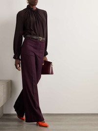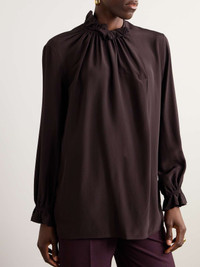 EDITORS'NOTES Victoria Beckham's blouse is designed to be elegant without effort. It’s cut from lightweight silk-voile and is detailed with delicate ruffles along the front. Wear yours with tailoring or more casual pants. SIZE & FIT Model measurements: - Fits true to size, take your normal size - Designed for a slightly loose fit - Lightweight, fluid, non-stretchy fabric - Model is 177cm/ 5'10" and is wearing a UK 8 - Bust: 79cm/ 31" - Waist: 61cm/ 24" - Hip: 89cm/ 35" DETAILS & CARE - Brown silk-voile - Concealed button-fastening keyhole at front - 100% silk - Dry clean