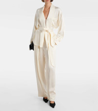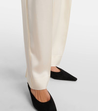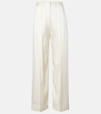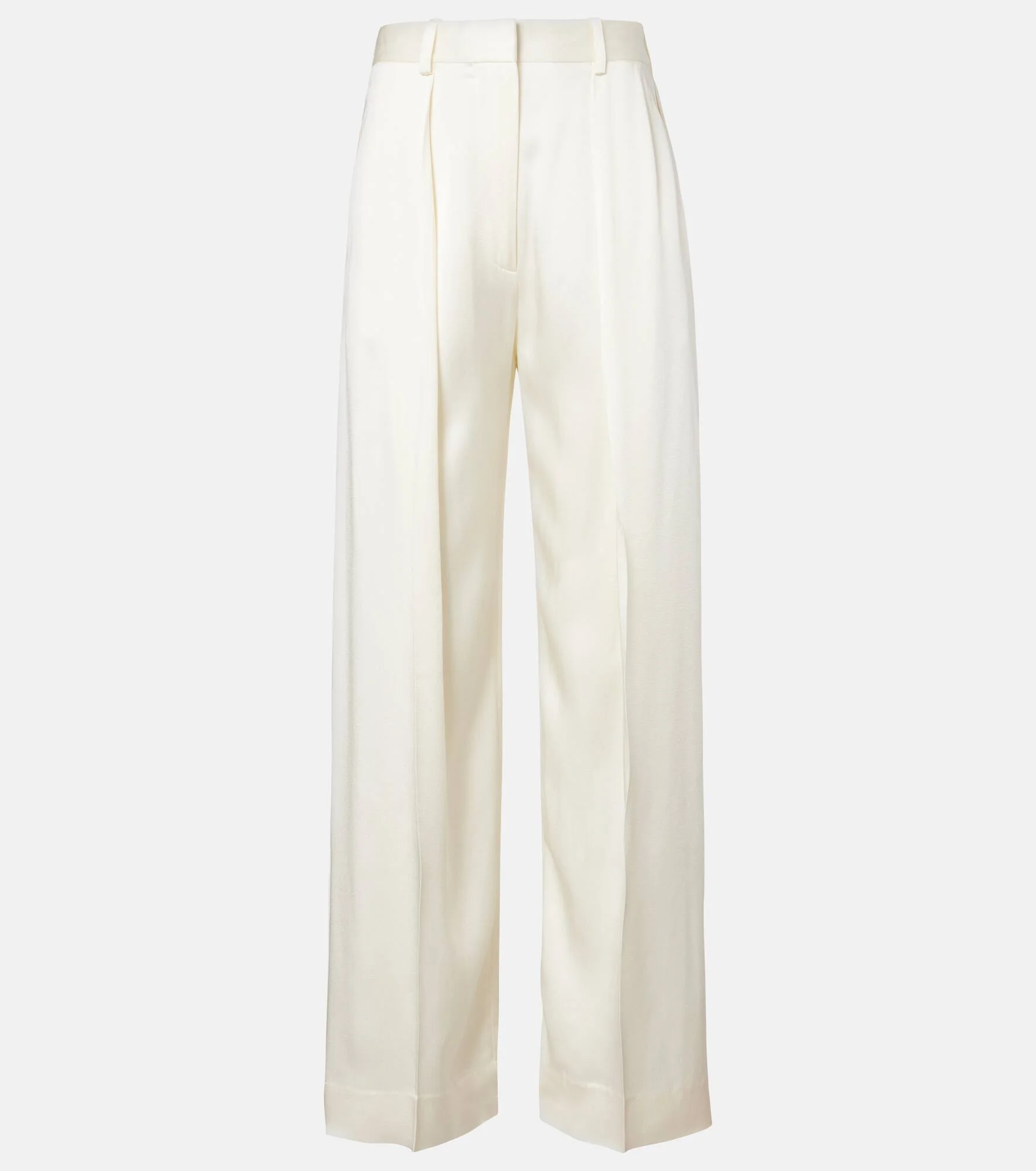 Victoria Beckham's eponymous label centers around chicly understated styles to create a versatile wardrobe. Made from luminous satin, these elegant pants feature a wide-leg silhouette with crisp front pleats and tall cuffs. Product Details - Material: 71% acetate, 29% viscose - Care instructions: dry clean - Made in Portugal - Designer color name: Ivory - Item color: white - Lining: 100% polyester - Closure: zip, hook, and button fastening - Belt loops - Pockets: slant pockets, back pockets - Single pleat - Item number: P01091733 Size & Fit - True to size - Non-stretchy fabric - Wide-leg - High-waisted - The model seen in the picture is 178cm-5'10" and wearing a size UK 8
