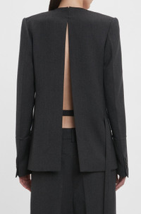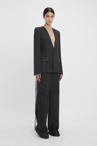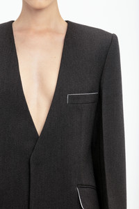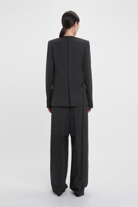 Beautifully crafted in 100% wool and immaculately cut for a well-defined silhouette, the Shrunken Collarless Jacket in Charcoal reflects the house’s reputation for impeccable tailoring. One of Victoria’s personal picks from the AW24 runway, this collarless design with minimal detailing creates a restrained aesthetic that looks professional and polished. Hard creases through the body and sleeve and a centre back detail add further refinement. Product Details - Collarless jacket - Contrast bind on front pockets - Narrow waist tie - Inner front strap fastening - Centre back detail with buttonholes and button - Hard creases on body and sleeve - The model is 178cm and is wearing a size 6 - Main: 100% Wool, Lining: 100% Viscose, Lining 2: 70% Cotton 30% Polyamide - Dry clean only - Made in Portugal