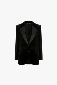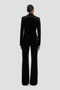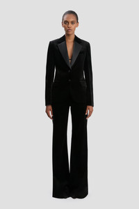 - Velvet single-breasted jacket - Satin covered button fastening - Internal chest pocket - Contrast satin welt pockets - Chest welt pocket - Centre back vent - Contrast satin lapels - Non-functional sleeve vent - 53% Polyester 43% Wool 4% Elastane - Made in Portugal The Single Breasted Tailored Jacket in velvet embraces classic tuxedo style. Two satin covered buttons fasten at the waist and a centre back vent ensures ease of movement. Contrasting satin lapels add a contemporary point of difference. SIZE & FIT - The model is 5'10’’/178cm and is wearing a size 6 - Fits true to size, take your normal size