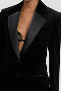 The Single Breasted Tailored Jacket in velvet embraces classic tuxedo style. Two satin covered buttons fasten at the waist and a centre back vent ensures ease of movement. Contrasting satin lapels add a contemporary point of difference. Size & Fit - The model is 5'10’’/178cm and is wearing a size 6 - Fits true to size, take your normal size Product Details - Velvet single-breasted jacket - Satin covered button fastening - Internal chest pocket - Contrast satin welt pockets - Chest welt pocket - Centre back vent - Contrast satin lapels - Non-functional sleeve vent - 53% Polyester 43% Wool 4% Elastane - Made in Portugal