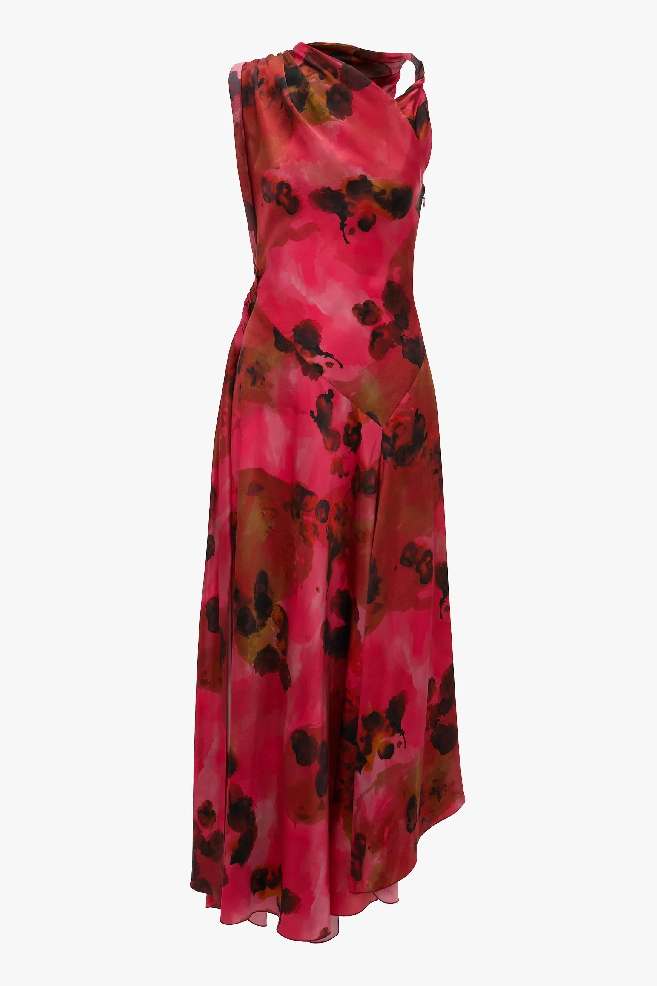 An asymmetric neckline and hemline bring a directional point of view to the Sleeveless Draped Midi Dress. Presented in a vibrant Raspberry Floral Print, it is crafted from 100% silk for a tactile finish and has a fitted waistline for a flattering silhouette. A pleated shoulder and twisted detail at the front neckline and side seam add attractive design details. Styled with the Harlow Stiletto Sandal Size & Fit - Fits true to size, take your regular size - The model height is 5'10''/178cm and is wearing a size UK 6 Product Details - Asymmetric design - Pleat shoulder detail - Twist details at front neckline and side seam - 100% Silk - Dry clean only - Made in Portugal