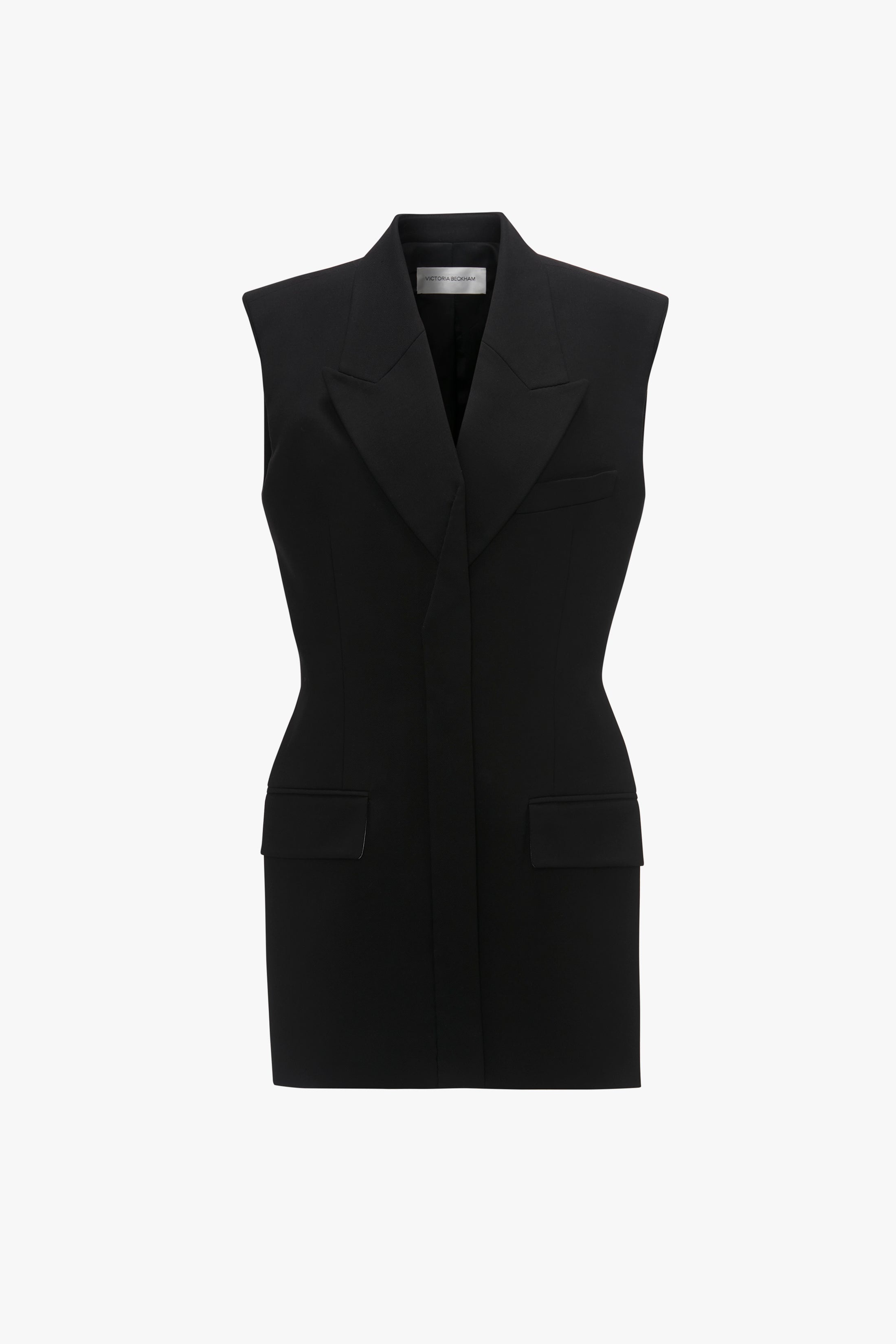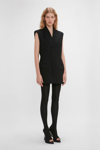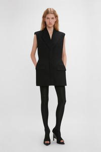 Featured on the SS24 runway, and a favourite of Victoria’s, the Sleeveless Tailored Dress offers a contemporary play on traditional tuxedo dressing. Immaculately tailored from a recycled wool blend and fully lined for a structured silhouette, it has an external placket with concealed buttons, side splits and shoulder pad inserts. The mini-length hemline adds a sexy playfulness to the directional aesthetic. Product Details - Recycled Fluid Wool - External placket detail with concealed button fastening - Shoulder pad inserts - Side splits - Fully lined - Front length (shoulder to hem): 85cm - Fits true to size, take your regular size - Main: 53% Polyester 43% Virgin Wool 4% Elastane - Lining: 100% Viscose - Second Lining: 70% Cotton 30% Polyamide - Dry Clean Only - Made in UK