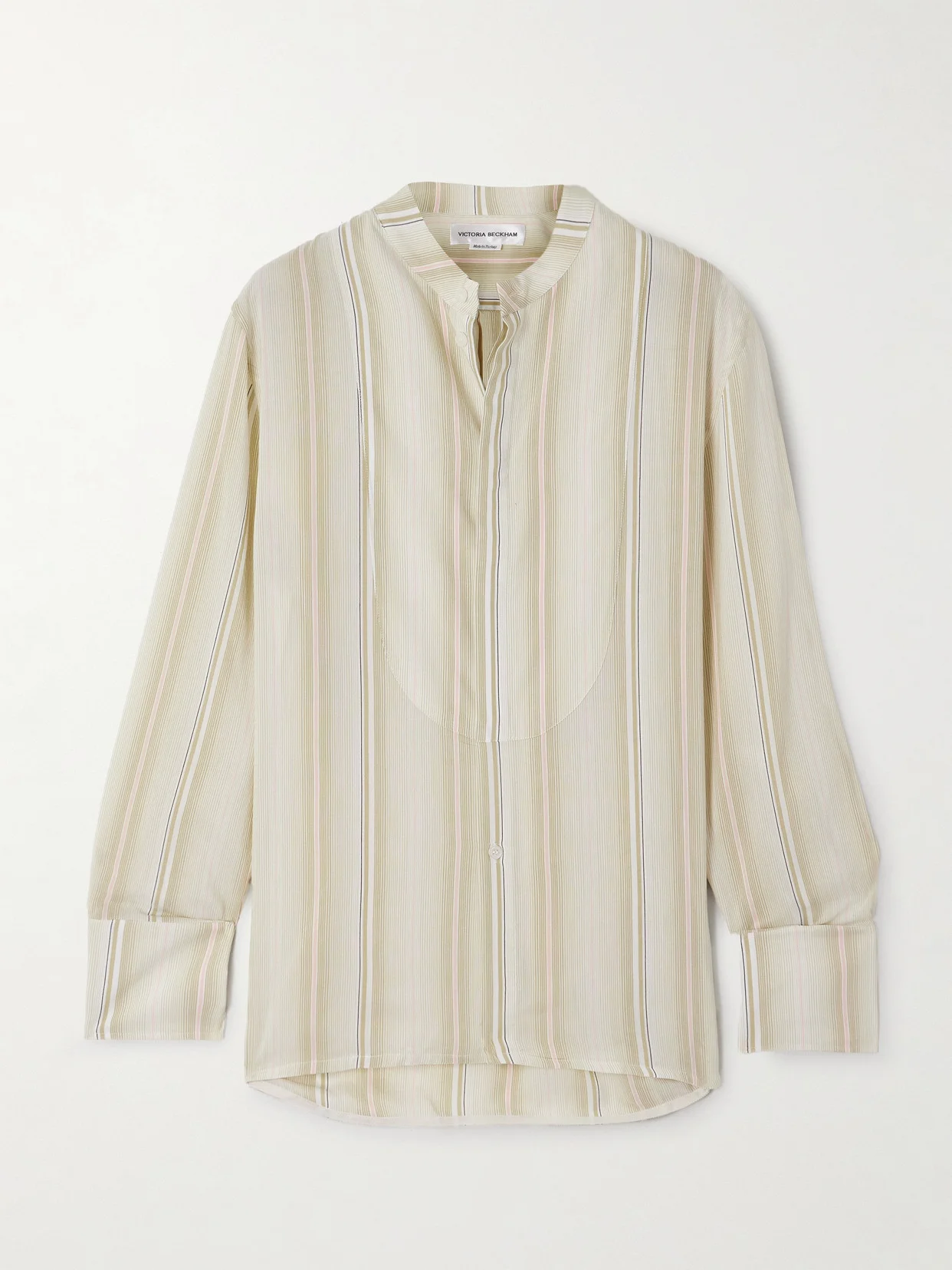 Victoria Beckham's shirt has a tuxedo-inspired bib that makes it feel a bit more elevated. Patterned with stripes, it's woven with a touch of silk and has a chic stand collar. Team yours with the matching pants.