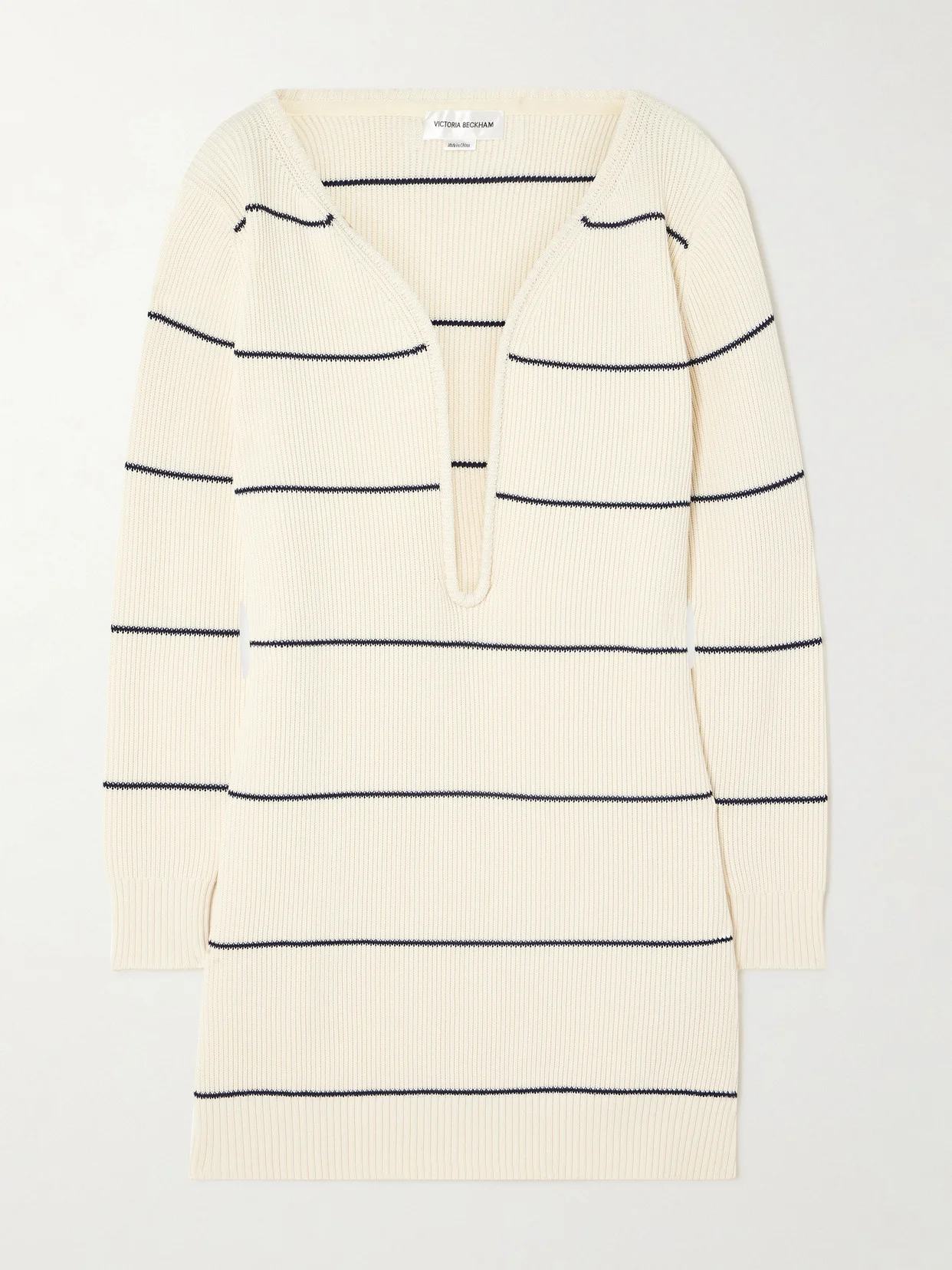 Victoria Beckham's mini dress has a curved V-shape neckline that elegantly frames your collarbones. Worn on the Spring '24 runway, it's made from ribbed cotton-blend patterned with classic pinstripes and has a relaxed fit. Echo the show styling by wearing yours with knee boots.