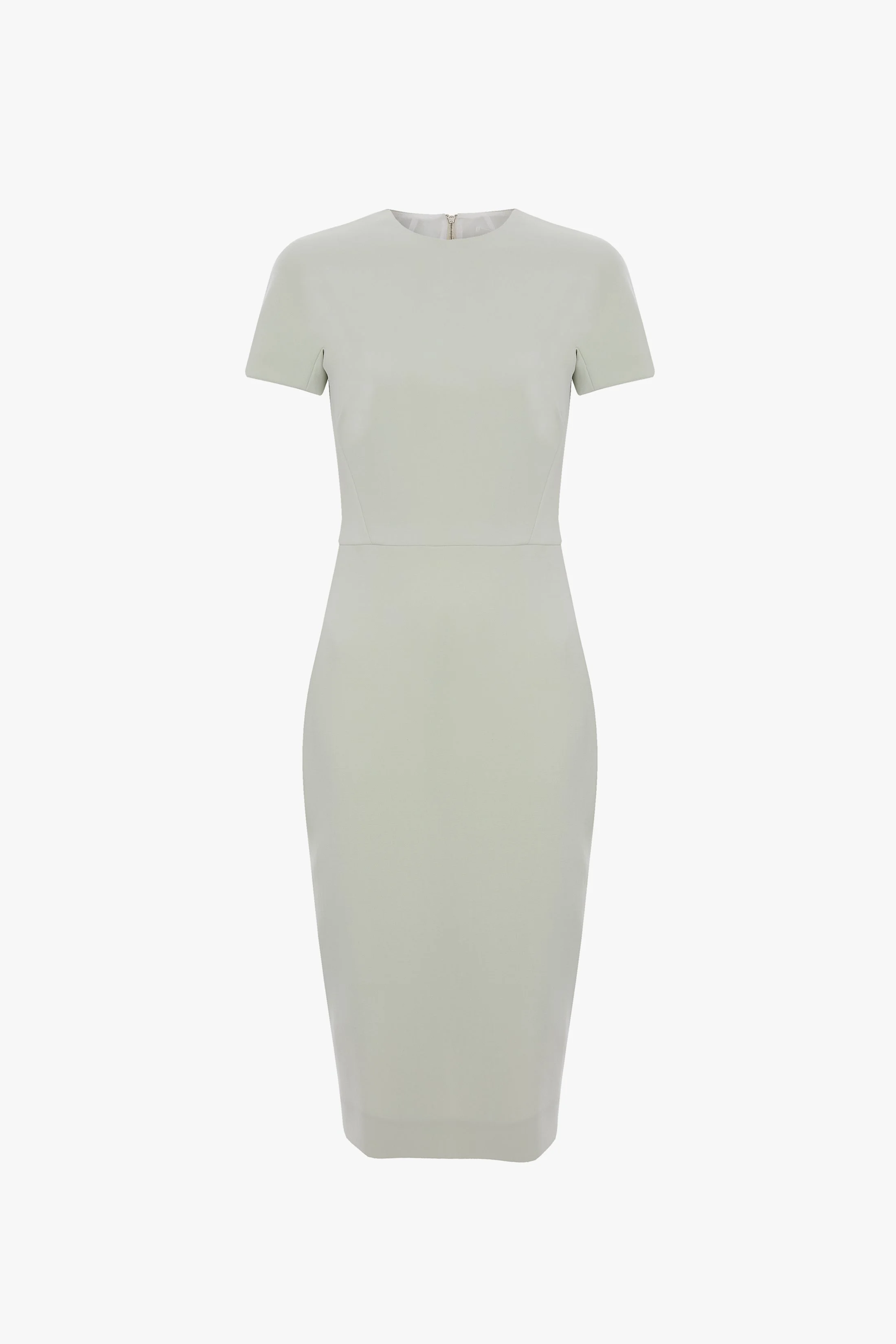 - Double wool crepe fabrication - Round neckline - Mild stretch - Exposed double ended back zip - Dart skirt detailing - Stretch jersey bodice lining - 45% Polyester 36% Virgin Wool 16% Polyamide 3% Elastane - Made in Portugal Inspired by the simplicity of a basic Tee, the Fitted T-Shirt Dress in Aloe has an understated sophistication. A modest round neckline, short sleeves and a midi-length hemline create a pared-back silhouette, while dart details and a double-ended exposed metal zip to the back add the house’s signature point of difference. SIZE & FIT - The model is 5'11’’/180cm and is wearing a size 6 - Fits true to size, take your normal size