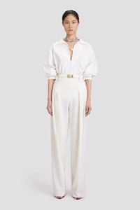 A unique reimagining of the traditional denim shirt, the Tab Detail Denim Top is characterised by a front opening with internal button and rouleau loop closure. Traditional utilitarian details include snap buttons at the cuffs and tobacco topstitching, while the Washed White colourway adds an elevated and modern sensibility. Size & Fit - The model height is 5'11"/180cm and is wearing a size UK 6 - Customers who desire a more fitted silhouette may wish to size down Product Details - White wash denim - Front opening with internal button and rouleau loop closure - Tonal topstitching with a contrast tobacco topstitch along the back yoke seam - 100% Cotton - Machine wash at 30C - Made in Italy
