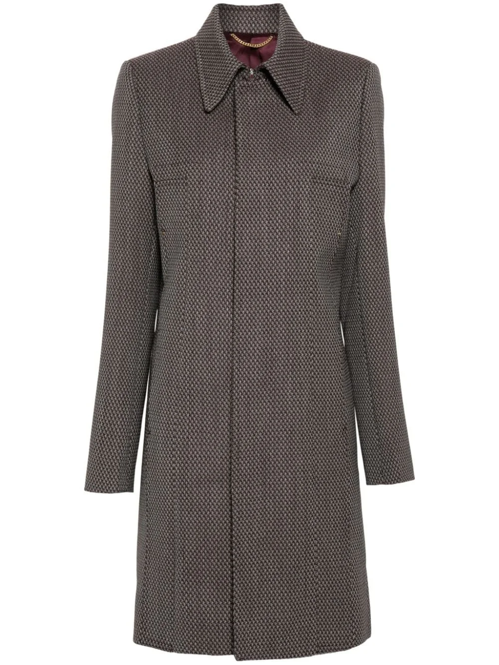 jacquard single-breasted coat Highlights - Cedar brown/multicolour - Virgin wool - Patterned jacquard - Straight-point collar - Throat latch - Concealed front button fastening - Shoulder pads - Long sleeves - Four front slip pockets - Central rear vent - Straight hem - Thigh-length - Satin lining Imported Composition Lining: Viscose 100%, Cotton 70%, Polyamide 30% Outer: Virgin Wool 100% SIZE & FIT Model measurements Height 5 ft 9 in(1.74 m) Bust/Chest 34.64 in(88 cm) Hips 36.61 in(93 cm) Waist 26.37 in(67 cm) FittingInformation Designed to be unstructured, offering a loose fit throughout The internal shoulder pads offer a structured shape Made from a midweight non-stretch fabric This piece fits true to size – take your usual size