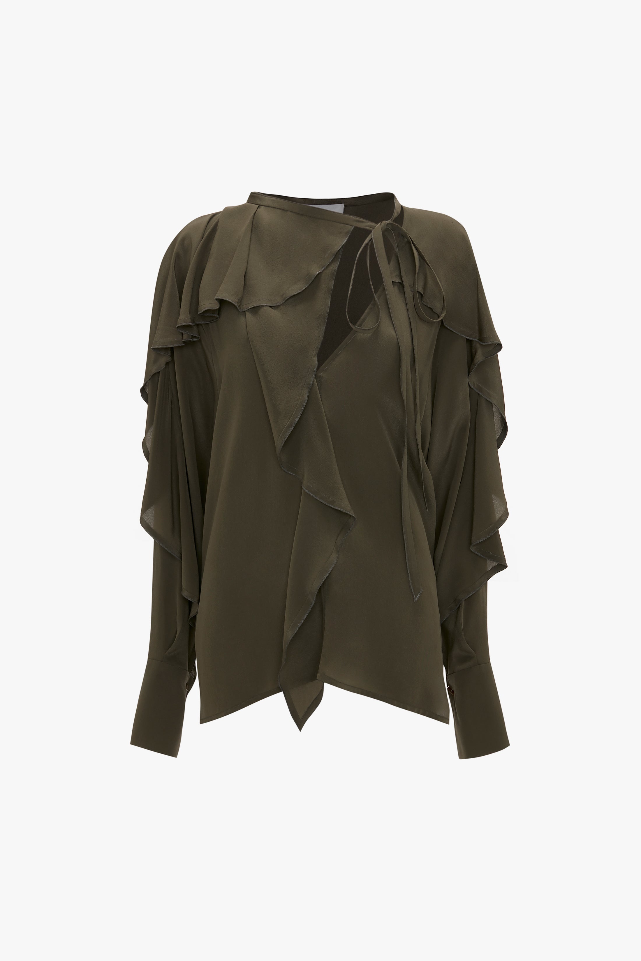 Product Details - Crepe de Chine - Long sleeve Shirt - Draped ruffle at sleeve and shoulder - V-neckline - Neck tie - Faux Horn cufflinks - Relaxed fit - The model height is 180cm and is wearing a size 6 - 100% Silk - Specialised Dry Clean Only - Made in Portugal