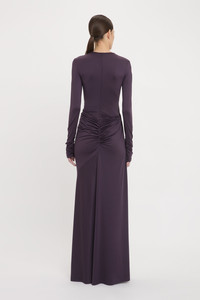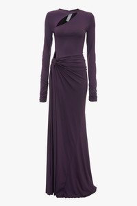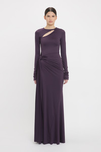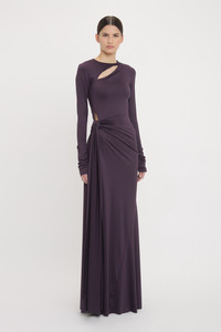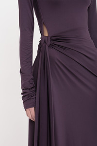 With its luxurious floor-pooling hemline and tactile knotted drape detail, the Long Sleeve Tie Front Gown embodies a quiet drama. Presented in regal Fig, it is crafted from stretch jersey for a svelte silhouette. Gathered detailing at the back of the skirt and a cut-out feature at the front add provocative points of difference, while a skirt split enhances the gown’s fluidity. Long sleeves with ruched cuffs complete the look. Size & Fit - Fits true to size, take your regular size - The model height is 5'10''/179cm and is wearing a size 6 Product Details - Stretch jersey fabrication - Round neckline with cut out detail at front - Long sleeve with gathering detail at the cuff - Knotted drape detail on the front skirt - V-shape back waist seam - Gathering detail on the skirt - Split in front skirt - 90% Polyester 10% Spandex - Dry clean only - Made In Portugal