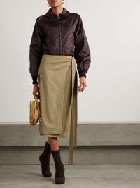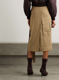 Victoria Beckham’s midi skirt is so effortlessly chic. It’s made from wool-twill in a pinstriped pattern and has a wrap-over front with long ties at the side. Style yours with a silk shirt and pumps. Size & Fit - Fits true to size, take your normal size - Midi-length, designed to be worn at the hip - Wraparound design, ties at the waist for an adjustable fit - Mid-weight, non-stretchy fabric - Model is 180cm/ 5'11" and is wearing a UK 8 Model measurements: - Bust: 76cm/ 30" - Waist: 64cm/ 25" - Hip: 86cm/ 34" Details & Care - Sand and white wool-twill - Ties and partially concealed button fastenings at side - 100% virgin wool; button: 100% horn (Buffalo); lining: 70% cotton, 30% polyamide - Dry clean