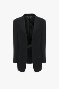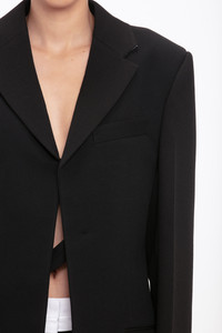 Contemporary tuxedo style is reflected in the Tux Jacket. A wide shoulder gives it a distinctive point of view, while sharp creases on the body and sleeves bring structure and definition. Tailored from a grain de poudre blend, it has a contrasting white melton fabric beneath the collar, front pockets with flaps, a single welt pocket at the chest and an inner tab for fastening. Size & Fit - Fits true to size, take your regular size - The model height is 5'10''/179cm and is wearing a size 6 Product Details - Grain Depoudre Blend fabrication - Wide shoulder detail - Contrast white melton fabric under the collar - Inner jacket tab for fastening - Front pockets with pocket flaps - Chest single welt pocket - Sharp creases on the body and sleeves - 55% Polyester 45% Wool - Dry clean only - Made In Portugal