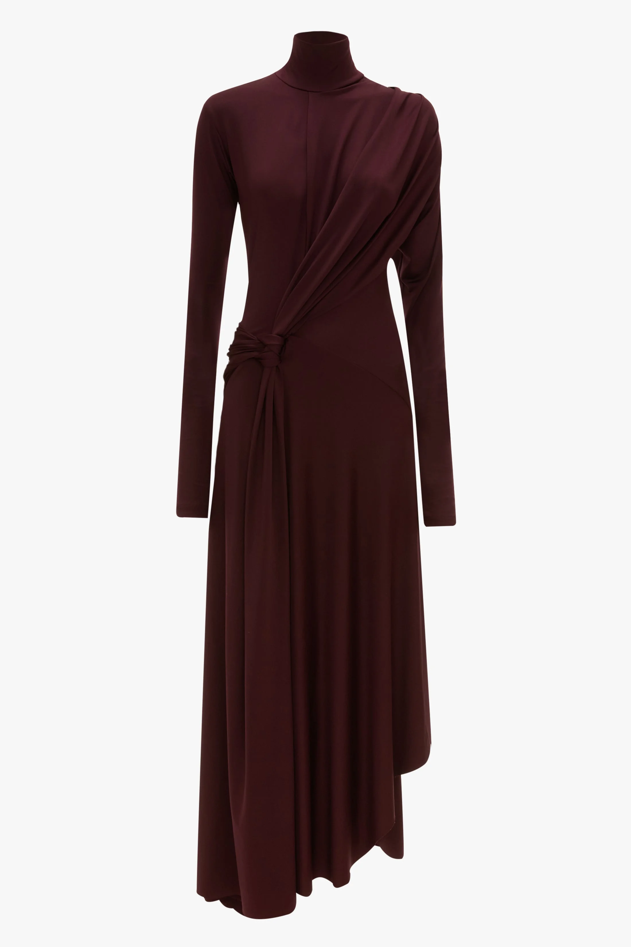 A twisted drape stretching from the left shoulder to the right hip brings a provocative point of difference to the Twist Detail High Neck dress. Crafted from stretch jersey and presented in rich Merlot, it has modest long sleeves, a demure high neckline and a directional asymmetric hemline. It exudes the house’s signature modest refinement. Size & Fit - Fits true to size, take your regular size - The model height is 5'11’’/180cm and is wearing a size 6 Product Details - Midi-length with asymmetric hem - Stretch jersey fabrication - Twist front waist panel - Gathers at the hip - 90% Polyester 10% Elastane - Dry Clean Only - Made in Portugal