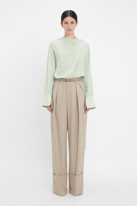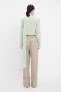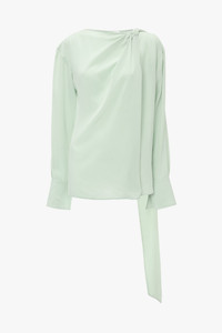 Understatedly elegant, the Twist Detail Scarf Top is characterised by a scarf tie that falls elegantly from the shoulder line. Crafted from 100% silk, it has a draped neckline with twist detail and deep cuffs with button and rouleau fastening for a luxurious finishing touch. Presented in a subdued shade of Jade, is an elevated piece for everyday wear. Product Details - Draped neckline top with twist detail - Long scarf trim attached at shoulder - Shoulder zip closure - Deep cuff detail - Fits true to size, take your regular size - The model height is 5'10''/179cm and is wearing a size 6 - 100% Silk - Dry clean only - Made In Portugal