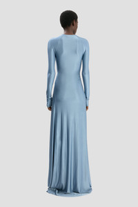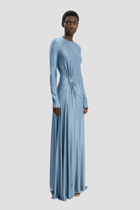 - High shine, stretch jersey fabrication - Floor-length - Round neckline - Long sleeves with raglan armhole, styled ruched at the cuff - Knot waist detail - Skirt side split - Concealed shoulder and side zip - 90% Viscose 10% Elastane - Made in Portugal The Twist Waist Gown’s modest silhouette is imbued with theatrical flair by virtue of a floor-pooling hemline and sensuous knotted detail at the front waist. Crafted from a body-sculpting high-shine jersey, it has a side-seam split and longer-length sleeves with tactile ruching at the cuff. SIZE & FIT - The model is 5'11’’/180cm and is wearing a size 6 - Fits true to size, take your normal size