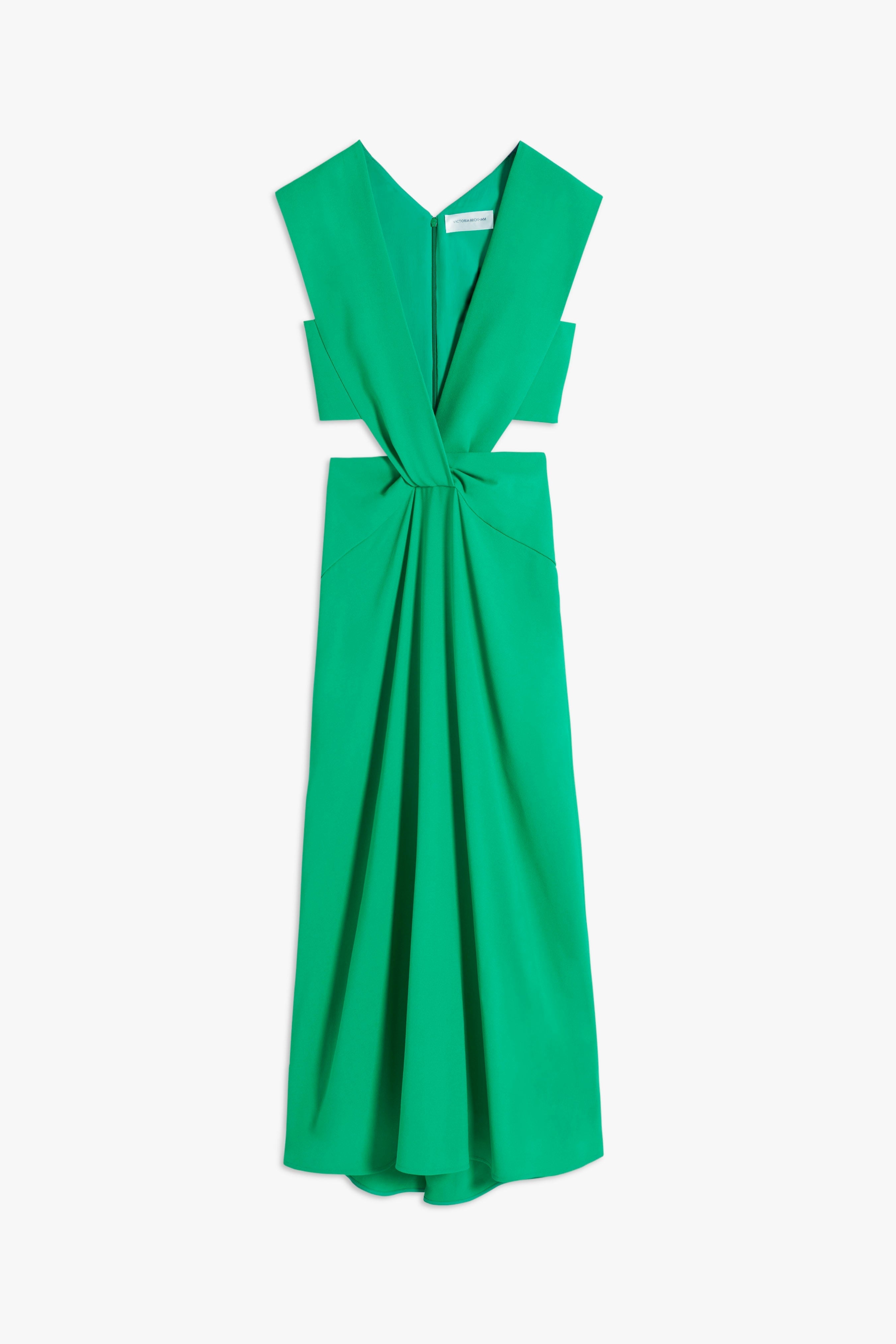Vibrant and refreshing hues such as the Bright Green of this Twist Wrap Midi Dress complement the utilitarian feel of the Autumn Winter 2022 collection. Made from a Cady Crepe Fabrication; this dress has a twisted wrap front at the waist-line, with an elongated V-neckline, and two cut outs at the waist for a touch of sensuality. Pair with signature VB heels for the completed look. Product Details - Matt Cady Crepe Fabrication - Fits true to size, take your regular size - Dress Length (Shoulder to Hemline): 132cm - Main: 100% Viscose - Lining: 100% Polyester - Machine Wash - Iron One Dot - The model is a standard IT 40 which equals a UK size 8