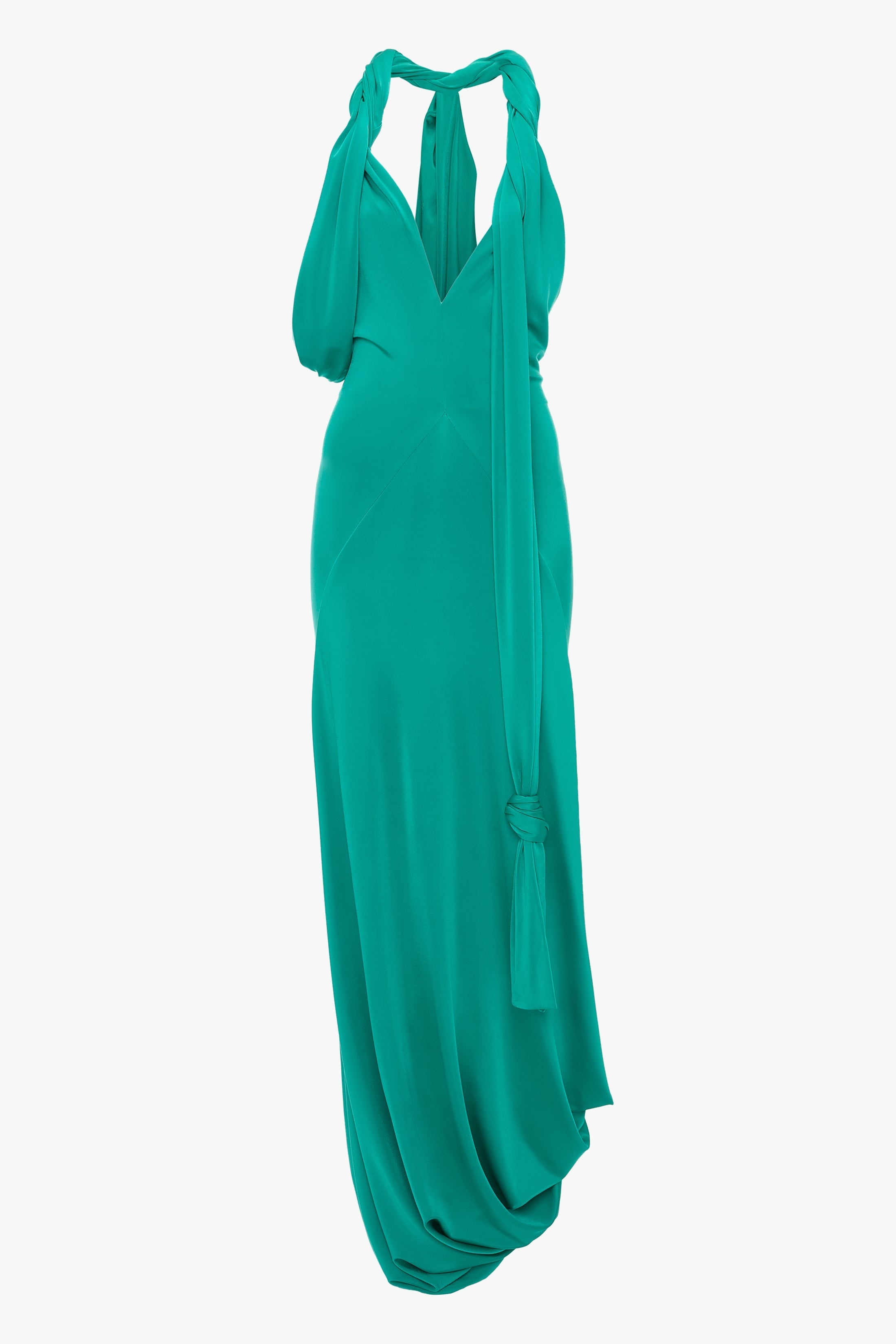 Unapologetically sexy, the Twisted Halter Strap Jersey Dress makes a confident statement. Crafted from a glamorous high-shine stretch jersey that skims and shapes the upper body, it has a V neckline with dramatically twisted halter-neck straps and draped detail under one arm. A knee-length tie with knotted detail brings a flamboyance to the silhouette that is enhanced by the extravagant shade of Peacock. An asymmetric draped hemline completes the look. Styled with the Cage High Heel Size & Fit - Fits true to size, take your regular size - The model height is 5'10''/179cm and is wearing a size 6 Product Details - Stretch jersey fabrication - Front V-neckline - Twisted halter neck with drape detail on right underarm - Knot detail to tie ends - Asymmetric hem - 100% Viscose - Dry clean only - Made In Portugal