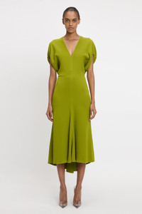 Directional sleeve detailing brings a discreet point of difference to the house’s signature midi dress style. Characterised by short full sleeves with tactile rope edging, the Blouson Detail Midi Dress in Parakeet also has a V neckline with internal binding and a longer-length hemline at the back for added fluidity. Styled with the PVC Heel Size & Fit - Fits true to size, take your regular size - The Model height is 5’11’’/ 180cm and is wearing a size 6 Product Details - Midi length - Hem graduates to be slightly longer at the back - Front v-neckline - Blouson short sleeve - Rope detail on sleeve opening - Internal binding detail on neckiine - Concealed zip with hook and eye closure at back - 50% Viscose 47% Acetate 3% Elastane - Dry clean only - Made in Portugal