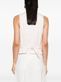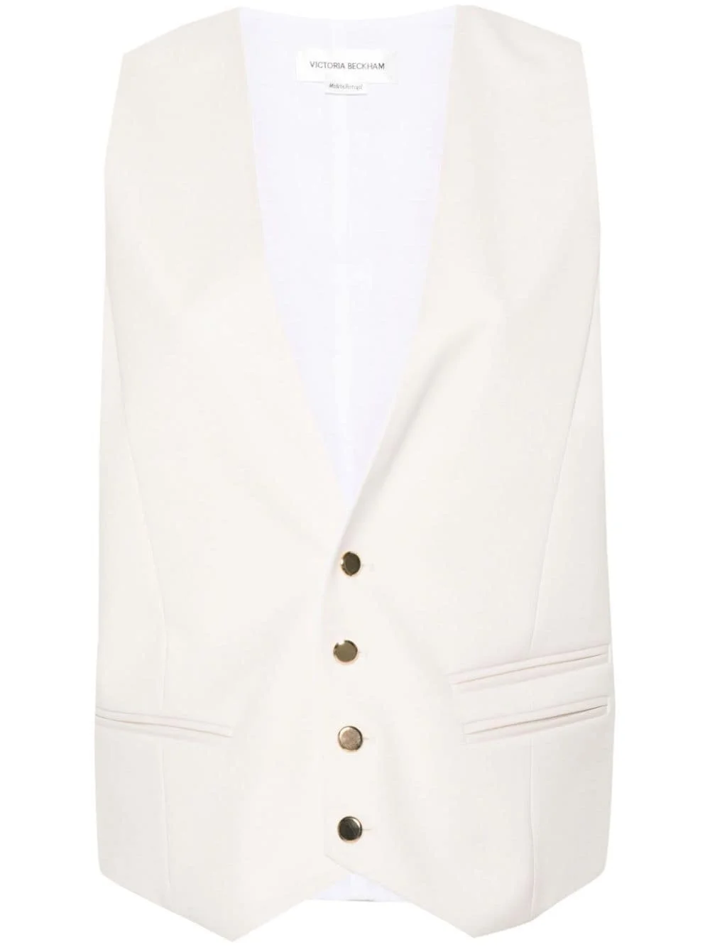 V-neck buttoned waistcoat Highlights - Bone white - Interlock twill weave - Dart detailing - Gold-tone buttons - V-neck - Front button fastening - Sleeveless - Adjustable strap to the rear - Three front jetted pockets - Straight hem Imported Composition Outer: Polyester 53%, Virgin Wool 43%, Elastane 4% Lining: Cotton 70%, Polyamide 30% SIZE & FIT Model measurements Height 5 ft 11 in(1.8 m) Bust/Chest 33.07 in(84 cm) Hips 37.4 in(95 cm) Waist 25.19 in(64 cm) FittingInformation Designed for a slim fit that sits just away from the body offering a close yet comfortable fit The adjustable tabs allow for fitted preferences Made from a midweight non-stretch fabric This piece fits true to size – take your usual size