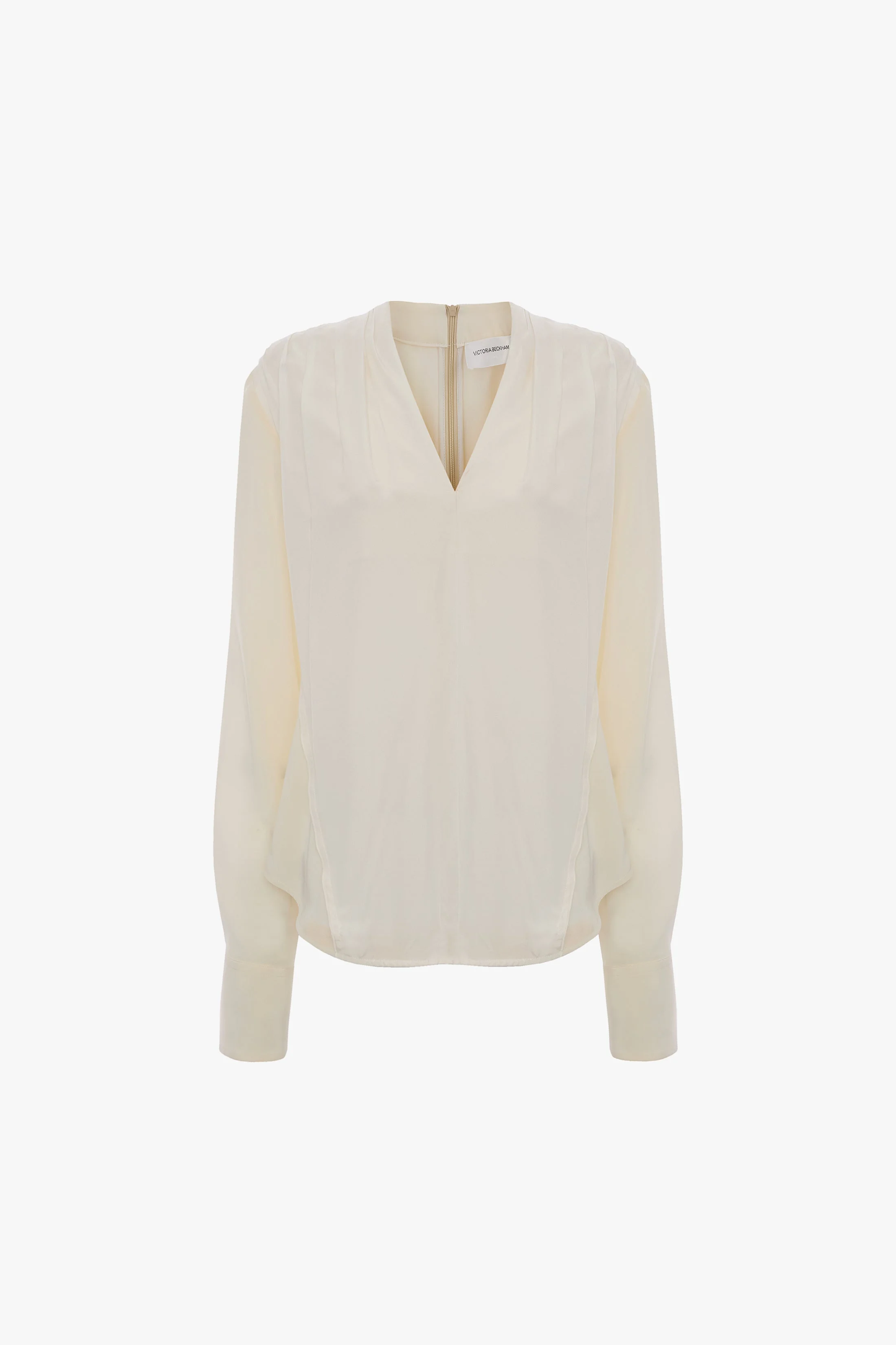 - Deep v-neck - Crepe de chine fabrication - Washed cupro front panel with irregular pleating - Exposed side seam detail - Long cuffed sleeves - Sleeve placket with single button - Optional button & loop closure - Invisible back zip - 100% Silk - Made in Portugal Tailored in a heavyweight crepe de chine, the V-Neck Top in Ivory embodies the house’s signature subtle sophistication. Long sleeves with distinctive overlong cuffs add a contemporary perspective, while a traditional V neckline is elevated with gathered detailing. Exposed side seams add a tactile point of difference. SIZE & FIT - The model is 5'10’’/178cm and is wearing a size 8 - Fits true to size, take your normal size