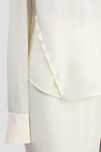 Tailored in a heavyweight crepe de chine, the V-Neck Gathered Top in Ivory embodies the house’s signature subtle sophistication. Long sleeves with distinctive overlong cuffs add a contemporary perspective, while a traditional V neckline is elevated with gathered detailing. Exposed side seams add a tactile point of difference. Size & Fit - The model is 5'10’’/178cm and is wearing a size 8 - Fits true to size, take your normal size Product Details - Deep v-neck - Crepe de chine fabrication - Washed cupro front panel with irregular pleating - Exposed side seam detail - Long cuffed sleeves - Sleeve placket with single button - Optional button & loop closure - Invisible back zip - 100% Silk - Made in Portugal