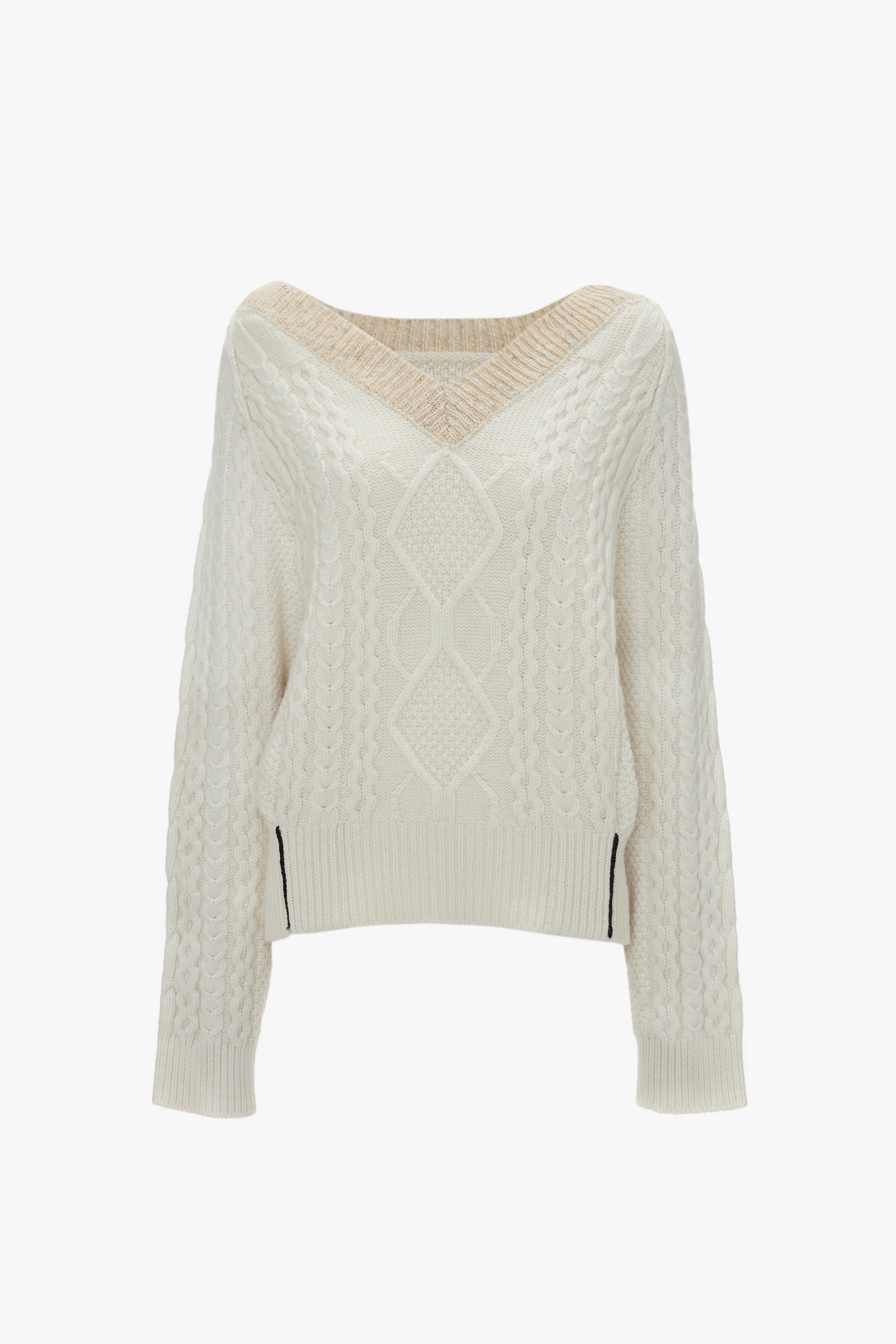 The traditional cable knit is reconsidered for the new season with a pleated hem, creating a feminine blouson effect through the body. Crafted from pure lambswool, the V-neck Jumper also has raglan armholes, keeping the aesthetic laidback but luxurious. A contrasting chain stitch at the hem adds a subtle point of interest. Styled with the Cropped Kick Trouser and Pointy Toe Stiletto Product Details - Lambswool Cable - Long sleeves - Raglan Armhole - V-neckline - Pleated hem for blouson through body - Contrast Chain Stitch Detail At Hem Rib - Heavier weight, chunky cable knit - Fits true to size. For a more fitted silhouette, we advise taking a size down - The model height is 180cm and is wearing a size 6 - 100% Lambswool - Specialised Dry Clean Only - Made in UK