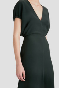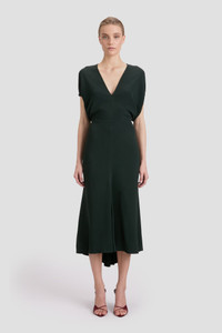 Effortlessly elegant midi dresses are a hallmark of the Victoria Beckham brand. The Blouson Detail Midi Dress in sumptuous Dark Pine is characterised by short full sleeves with directional rope edging. A front V neckline with internal binding adds a subtle talking point, while a longer-length hemline at the back adds fluidity to the silhouette. A fitted waist ensures a figure-flattering finish. Styled with the Harlow Stiletto Sandal Size & Fit - Fits true to size, take your regular size - The model height is 5'10''/178cm and is wearing a size UK 6 Product Details - Front v-neckline - Contrast internal binding detail at neckline - Midi-length - Fitted at the waist - Blousson sleeve detail - Gathered sleeve hem with internal cord detail - Hem graduates to be slightly longer at the back - 50% Viscose 47% Acetate 3% Elastane - Dry clean only - Made in Portugal