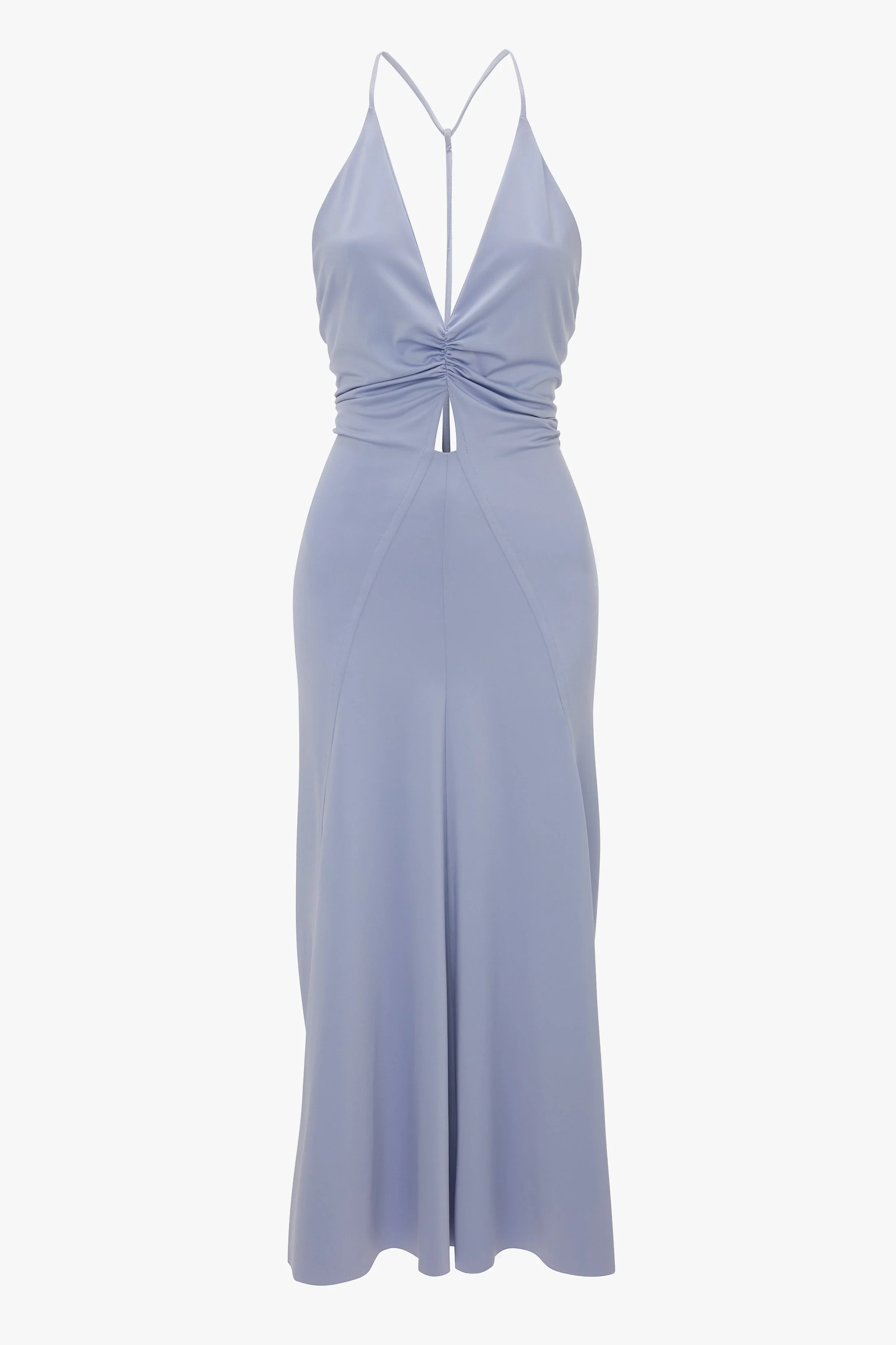 Camisole dresses are a house signature and the V-Neck Ruched Cami Midi Dress in delicate Delphinium Blue brings fresh personality to the 1990s-inspired favourite. Refreshed with a gathered front bodice and subtle cut-out detail at the front waist, it offers a sensuous update for the new season. Crafted in stretch jersey and cut with a fitted bodice and full skirt, the V-Neck Ruched Cami Midi is finished with a low back and single centre strap. Styled with the Harlow Stiletto Sandal Product Details - Stretch jersey fabrication - V neck line and small cut out at front waist - Low back with single centre back strap - Fitted through bodice - Gathering back detail - Fits true to size, take your regular size - 90% Polyester 10% Elastane - Dry clean only - Made in Portugal