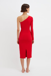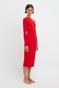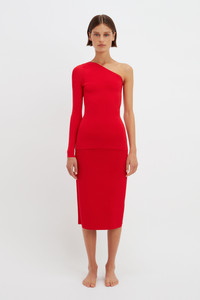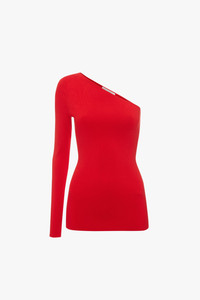 The latest VB Body collection sees mainstay pieces reimagined in a bold red shade that’s universally flattering. The One Shoulder Top is a favourite of Victoria’s, the easy-to-wear silhouette transcending seasons. It’s made from our signature compact knitwear fabric that has both structure and stretch, simultaneously shaping and sculpting the body. The cut finishes across the hips, making it ideal for tucking into high-waisted tailored trousers or layering over the Fitted Skirt. Product Details - Compact Viscose Fabrication - Fits True To Size, Take Your Regular Size - Main: 73% Viscose, 15% Polyester, 12% Spandex